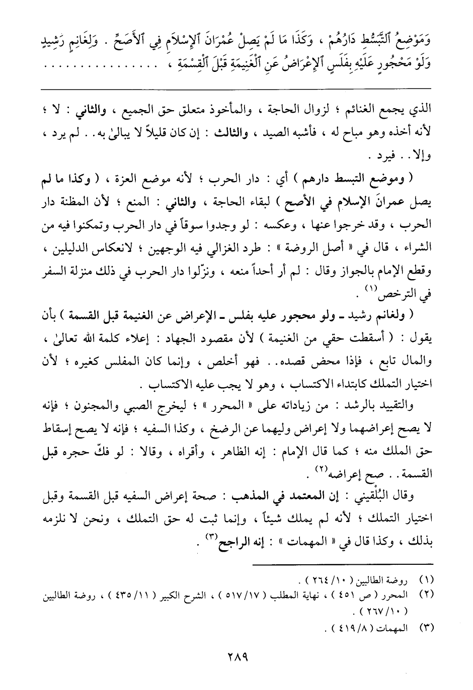 (ولغانم رشيد - ولو محجور عليه بفلس - الإعراض عن الغنيمة قبل القسمة) بأن يقول: (أسقطت حقي من الغنيمة) لأن مقصود الجهاد: إعلاء كلمة الله تعالى، والمال تابع، فإذا محض قصده .. فهو أخلص، وإنما كان المفلس كغيره؛ لأن اختيار التملك كابتداء الاكتساب، وهو لا يجب عليه الاكتساب.