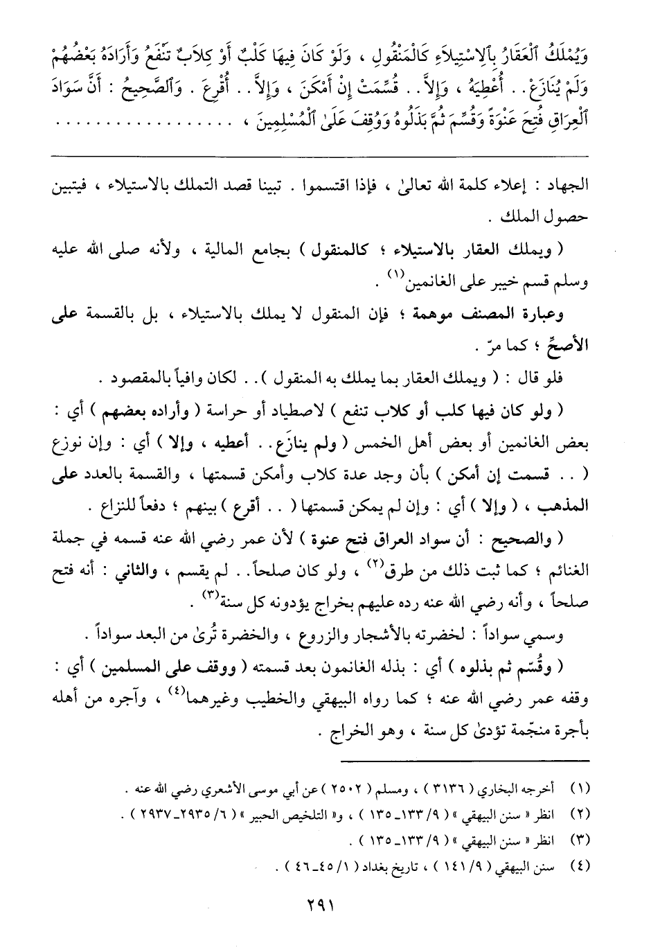 (وقُسّم ثم بذلوه) أي: بذله الغانمون بعد قسمته (ووقف على المسلمين) أي: وقفه عمر رضي الله عنه؛ كما رواه البيهقي والخطيب وغيرهما (٤)، وآجره من أهله بأجرة منجّمة تؤدى كل سنة، وهو الخراج.