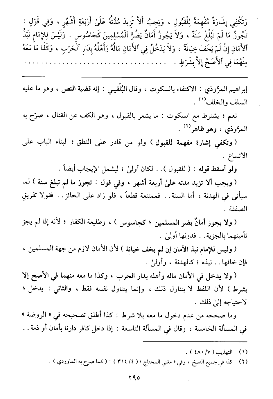 (ويجب ألا تزيد مدته على أربعة أشهر، وفي قول: تجوز ما لم تبلغ سنة) لما سيأتي في الهدنة، أما السنة .. فممتنعة قطعًا، فلو زاد على الجائز .. فقولا تفريقِ الصفقة.