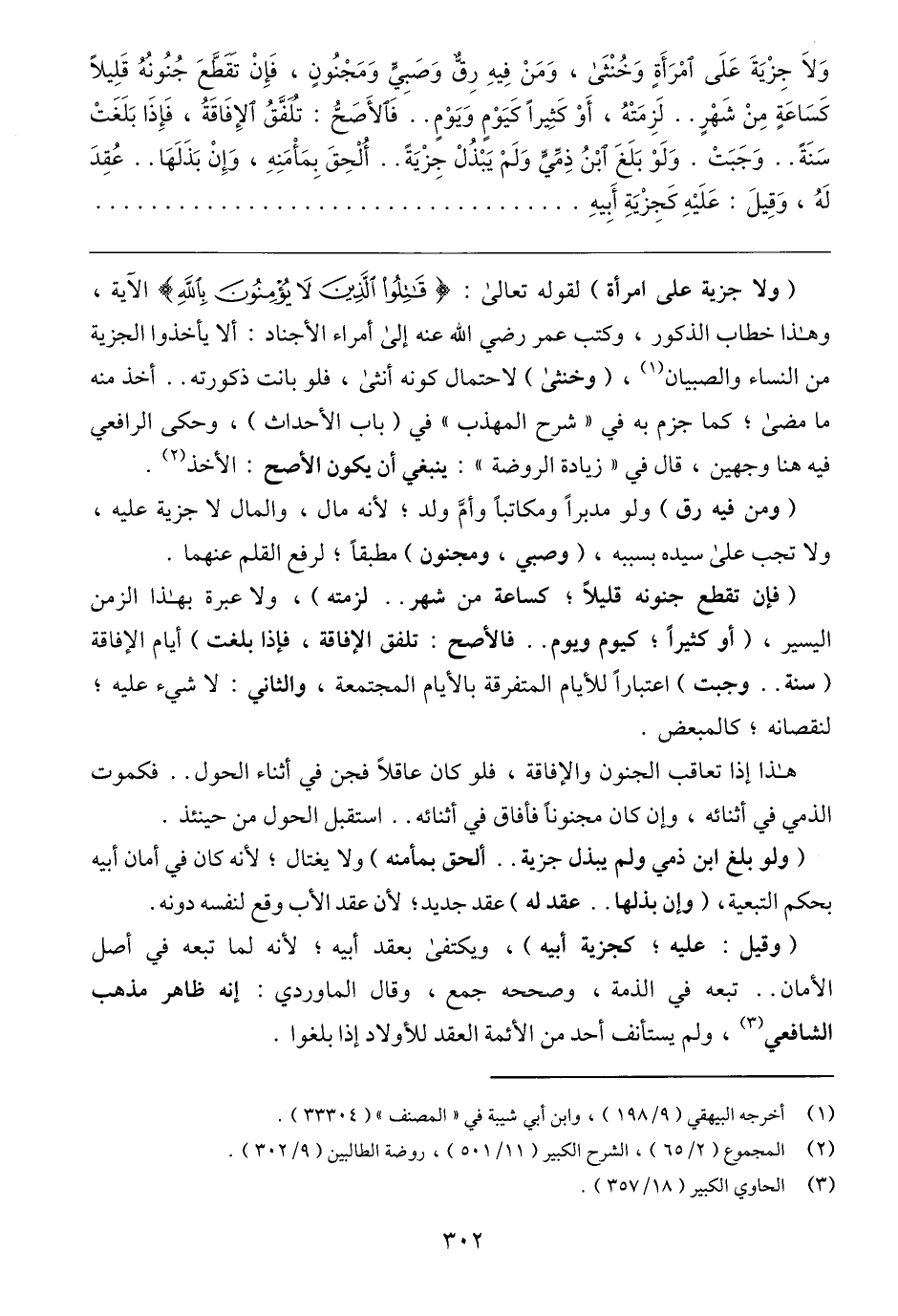 (ومن فيه رق) ولو مدبرًا ومكاتبًا وأمَّ ولد؛ لأنه مال، والمال لا جزية عليه، ولا تجب على سيده بسببه، (وصبي، ومجنون) مطبقًا؛ لرفع القلم عنهما.