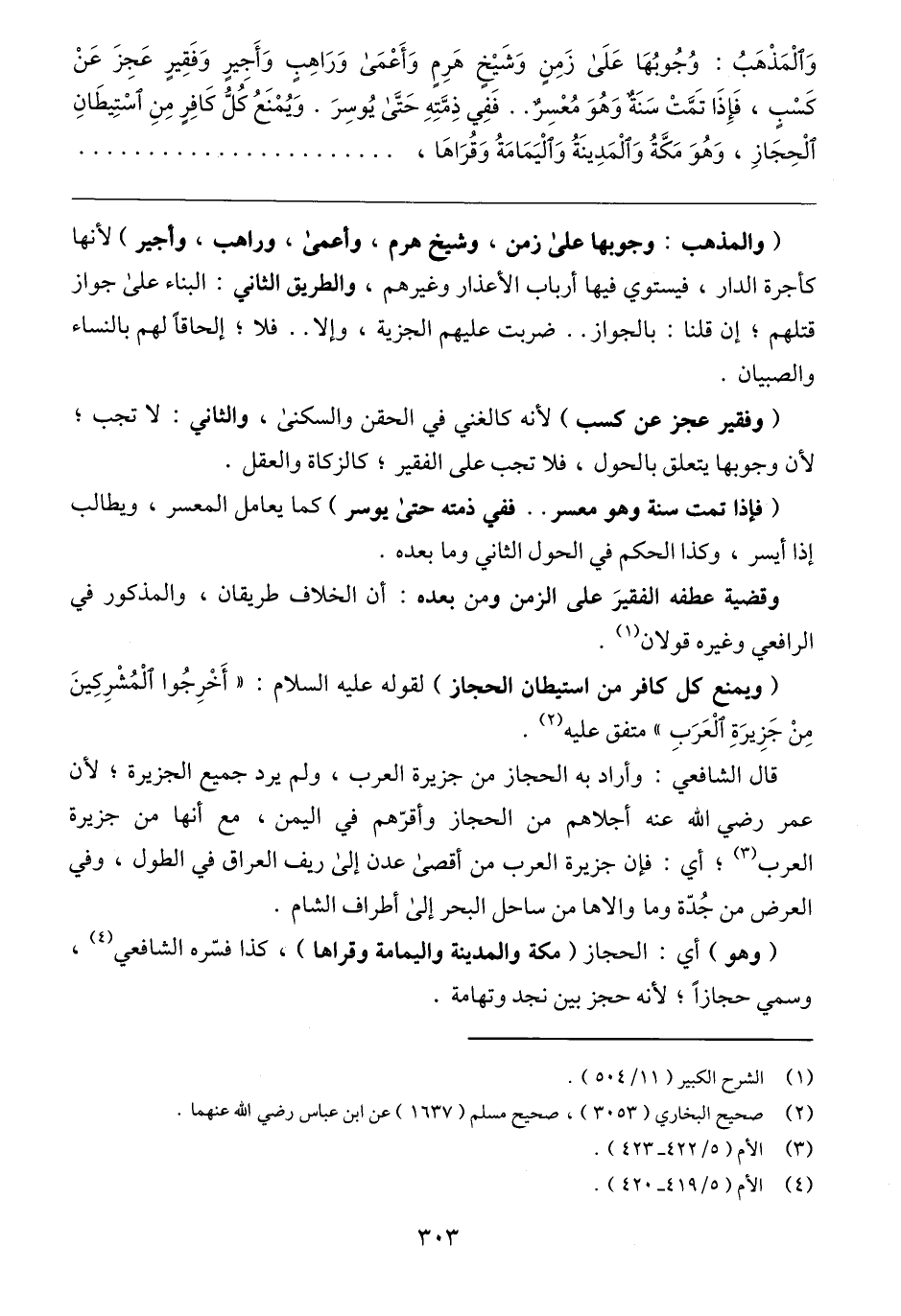 قال الشافعي: وأراد به الحجاز من جزيرة العرب، ولم يرد جميع الجزيرة؛ لأن عمر رضي الله عنه أجلاهم من الحجاز وأقرّهم في اليمن، مع أنها من جزيرة العرب (٣)؛ أي: فإن جزيرة العرب من أقصى عدن إلى ريف العراق في الطول، وفي العرض من جُدّة وما والاها من ساحل البحر إلى أطراف الشام.