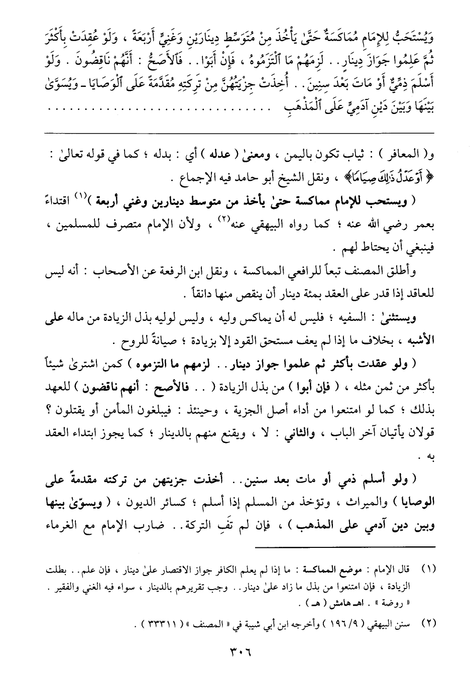 (ويستحب للإمام مماكسة حتى يأخذ من متوسط دينارين وغني أربعة) (١) اقتداءً بعمر رضي الله عنه؛ كما رواه البيهقي عنه (٢)، ولأن الإمام متصرف للمسلمين، فينبغي أن يحتاط لهم.
