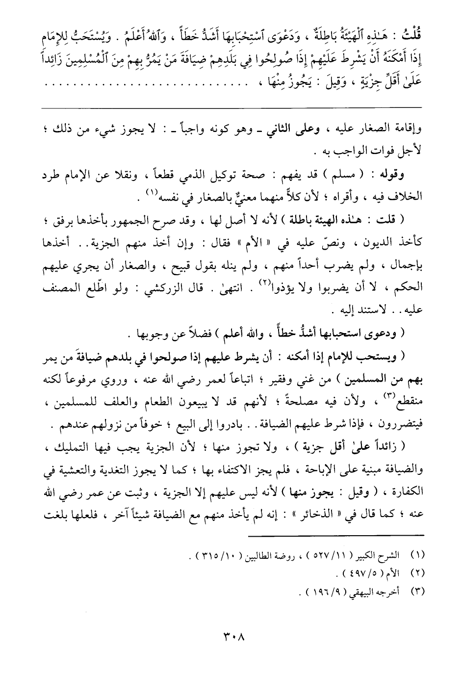 (ويستحب للإمام إذا أمكنه: أن يشرط عليهم إذا صولحوا في بلدهم ضيافةَ من يمر بهم من المسلمين) من غني وفقير؛ اتباعًا لعمر رضي الله عنه، وروي مرفوعًا لكنه منقطع (٣)، ولأن فيه مصلحةً؛ لأنهم قد لايبيعون الطعام والعلف للمسلمين، فيتضررون، فإذا شرط عليهم الضيافة .. بادروا إلى البيع؛ خوفًا من نزولهم عندهم.