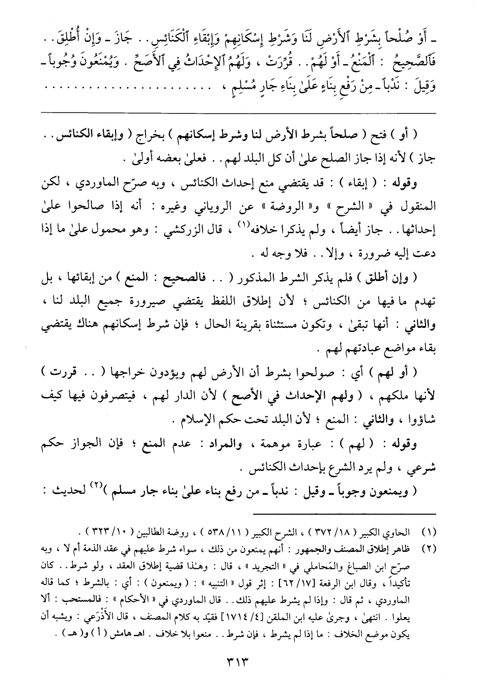 وقوله: (إبقاء): قد يقتضي منع إحداث الكنائس، وبه صرّح الماوردي، لكن المنقول في "الشرح" و"الروضة" عن الروياني وغيره: أنه إذا صالحوا على إحداثها ... جاز أيضًا، ولم يذكرا خلافه (١)، قال الزركشي: وهو محمول على ما إذا دعت إليه ضرورة، وإلا .. فلا وجه له.