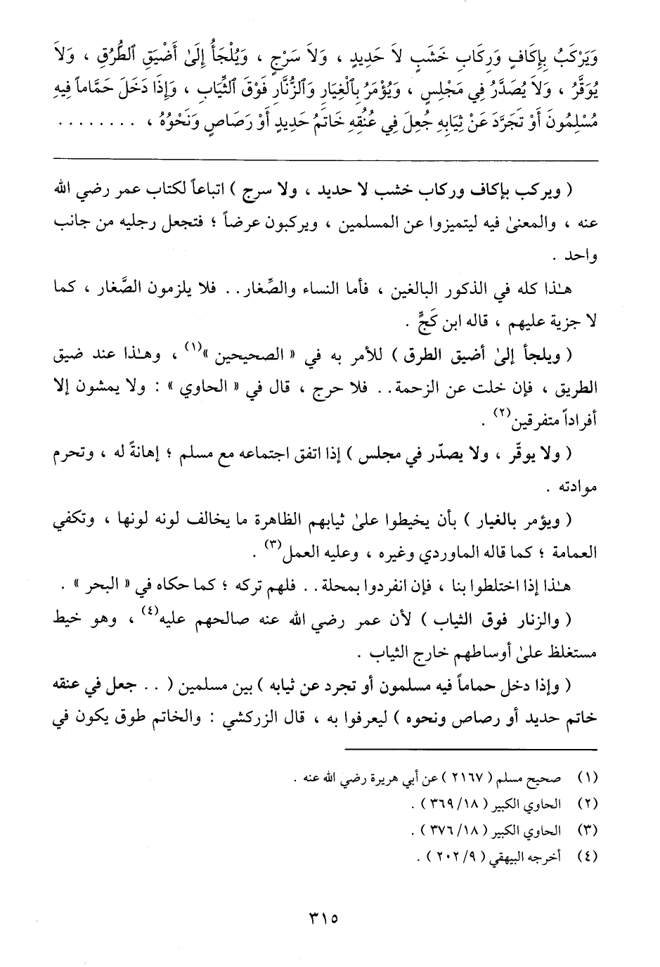 (ويركب بإكاف وركاب خشب لا حديد، ولا سرج) اتباعًا لكتاب عمر رضي الله عنه، والمعنى فيه ليتميزوا عن المسلمين، ويركبون عرضًا؛ فتجعل رجليه من جانب واحد.