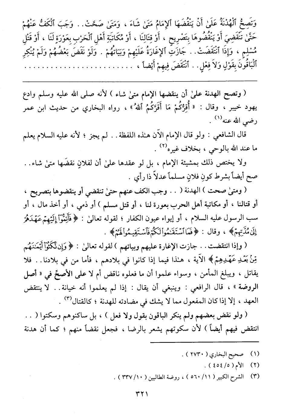 (ومتى صحت) الهدنة ( .. وجب الكف عنهم حتى تنقضي أو ينقضوها بتصريح، أو قتالنا، أو مكاتبة أهل الحرب بعورة لنا، أو قتل مسلم) أو ذمي، أو أخذ مال، أو سب الرسول عليه السلام، أو إيواء عيون الكفار؛ لقوله تعالى: {فَأَتِمُّوا إِلَيْهِمْ عَهْدَهُمْ إِلَى مُدَّتِهِمْ}، وقال: {فَمَا اسْتَقَامُوا لَكُمْ فَاسْتَقِيمُوا لَهُمْ}.
