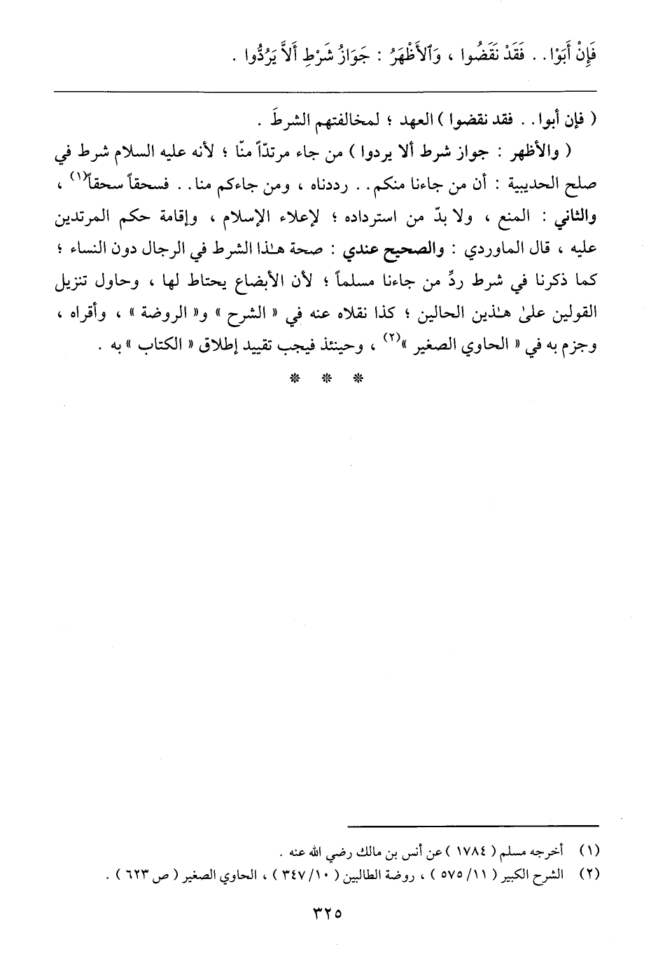 (والأظهر: جواز شرط الا يردوا) من جاء مرتدًّا منّا؛ لأنه عليه السلام شرط في صلح الحديبية: أن من جاءنا منكم .. رددناه، ومن جاءكم منا .. فسحقًا سحقًا (١)، والثاني: المنع، ولا بدّ من استرداده؛ لإعلاء الإسلام، وإقامة حكم المرتدين عليه، قال الماوردي: والصحيح عندي: صحة هذا الشرط في الرجال دون النساء؛ كما ذكرنا في شرط ردِّ من جاءنا مسلمًا؛ لأن الأبضاع يحتاط لها، وحاول تنزيل القولين على هذين الحالين؛ كذا نقلاه عنه في "الشرح" و"الروضة"، وأقراه، وجزم به في "الحاوي الصغير" (٢)، وحينئذ فيجب تقييد إطلاق "الكتاب" به.