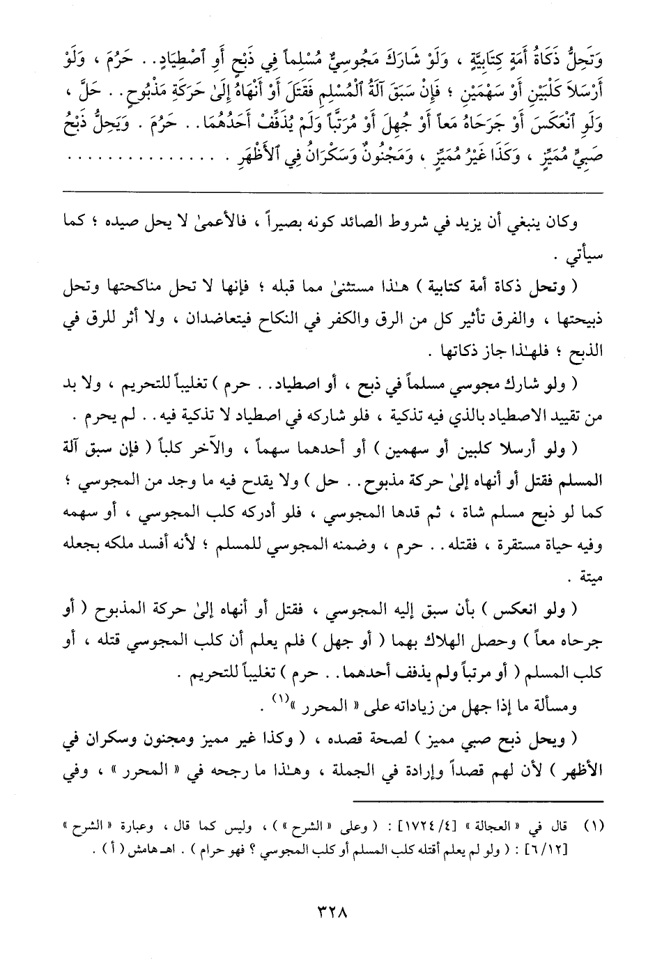 (ولو شارك مجوسي مسلمًا في ذبح، أو اصطياد .. حرم) تغليبًا للتحريم، ولا بد من تقييد الاصطياد بالذي فيه تذكية، فلو شاركه في اصطياد لا تذكية فيه .. لم يحرم.