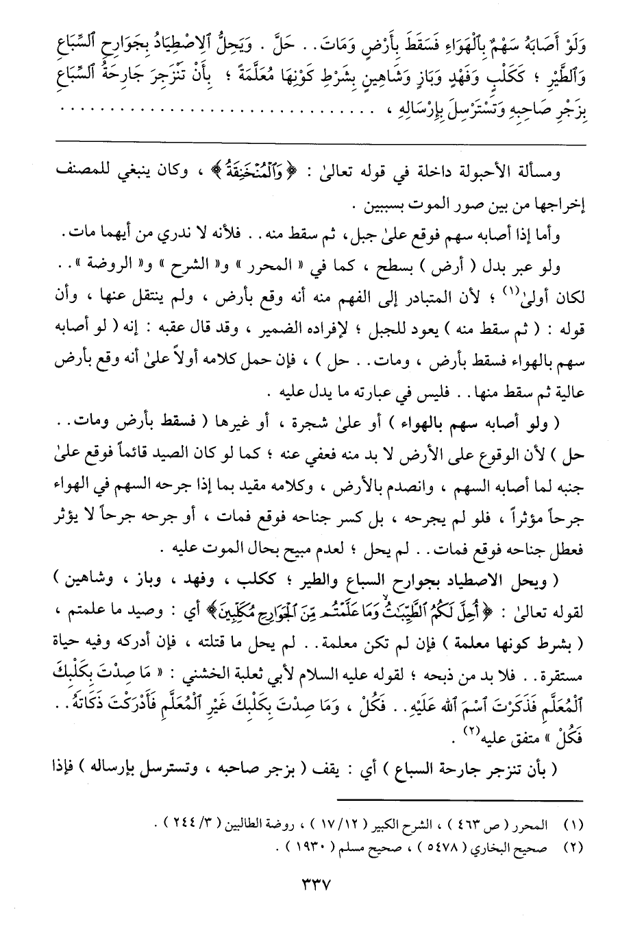 (ويحل الاصطياد بجوارح السباع والطير؛ ككلب، وفهد، وباز، وشاهين) لقوله تعالى: {أُحِلَّ لَهُمْ قُلْ أُحِلَّ لَكُمُ الطَّيِّبَاتُ وَمَا عَلَّمْتُمْ مِنَ الْجَوَارِحِ مُكَلِّبِينَ} أي: وصيد ما علمتم، (بشرط كونها معلمة) فإن لم تكن معلمة .. لم يحل ما قتلته، فإن أدركه وفيه حياة مستقرة .. فلا بد من ذبحه؛ لقوله عليه السلام لأبي ثعلبة الخشني: "مَا صِدْتَ بِكَلْبِكَ الْمُعَلَّمِ فَذَكَرْتَ اسْمَ الله عَلَيْهِ .. فَكُلْ، وَمَا صِدْتَ بِكَلْبِكَ غَيْرِ الْمُعَلَّمِ فَأَدْرَكْتَ ذَكَاتَهُ .. فَكُلْ" متفق عليه (٢).