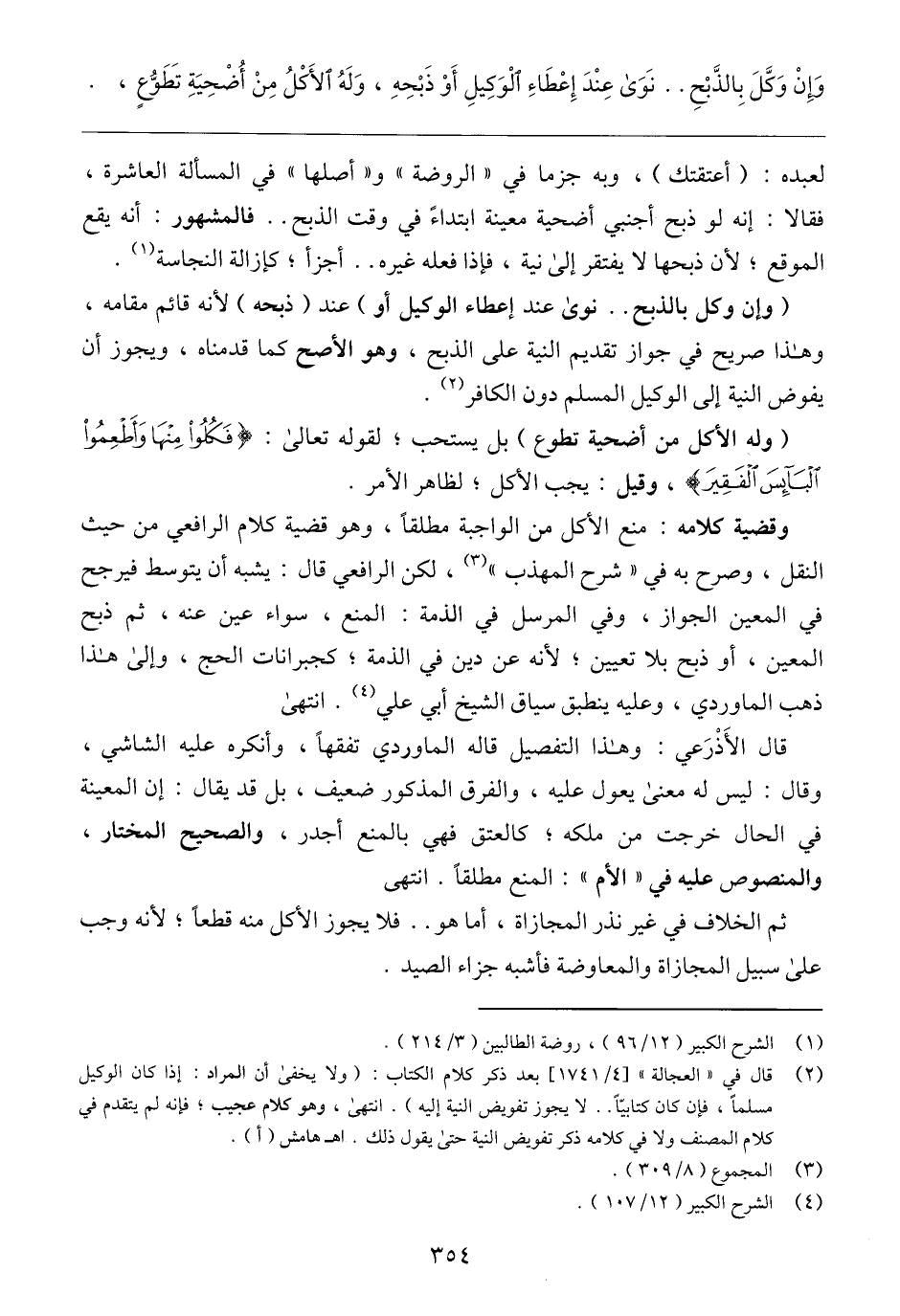 (٢) قال في "العجالة" [٤/ ١٧٤١] بعد ذكر كلام الكتاب: (ولا يخفى أن المراد: إذا كان الوكيل مسلمًا، فإن كان كتابيًّا .. لا يجوز تفويض النية إليه). انتهى، وهو كلام عجيب؛ فإنه لم يتقدم في كلام المصنف ولا في كلامه ذكر تفويض النية حتى يقول ذلك. اهـ هامش (أ).