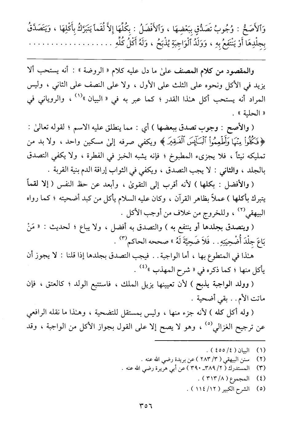 هذا في المتطوع بها، أما الواجبة .. فيجب التصدق بجلدها إذا قلنا: لا يجوز أن يأكل منها؛ كما ذكره في "شرح المهذب" (٤).