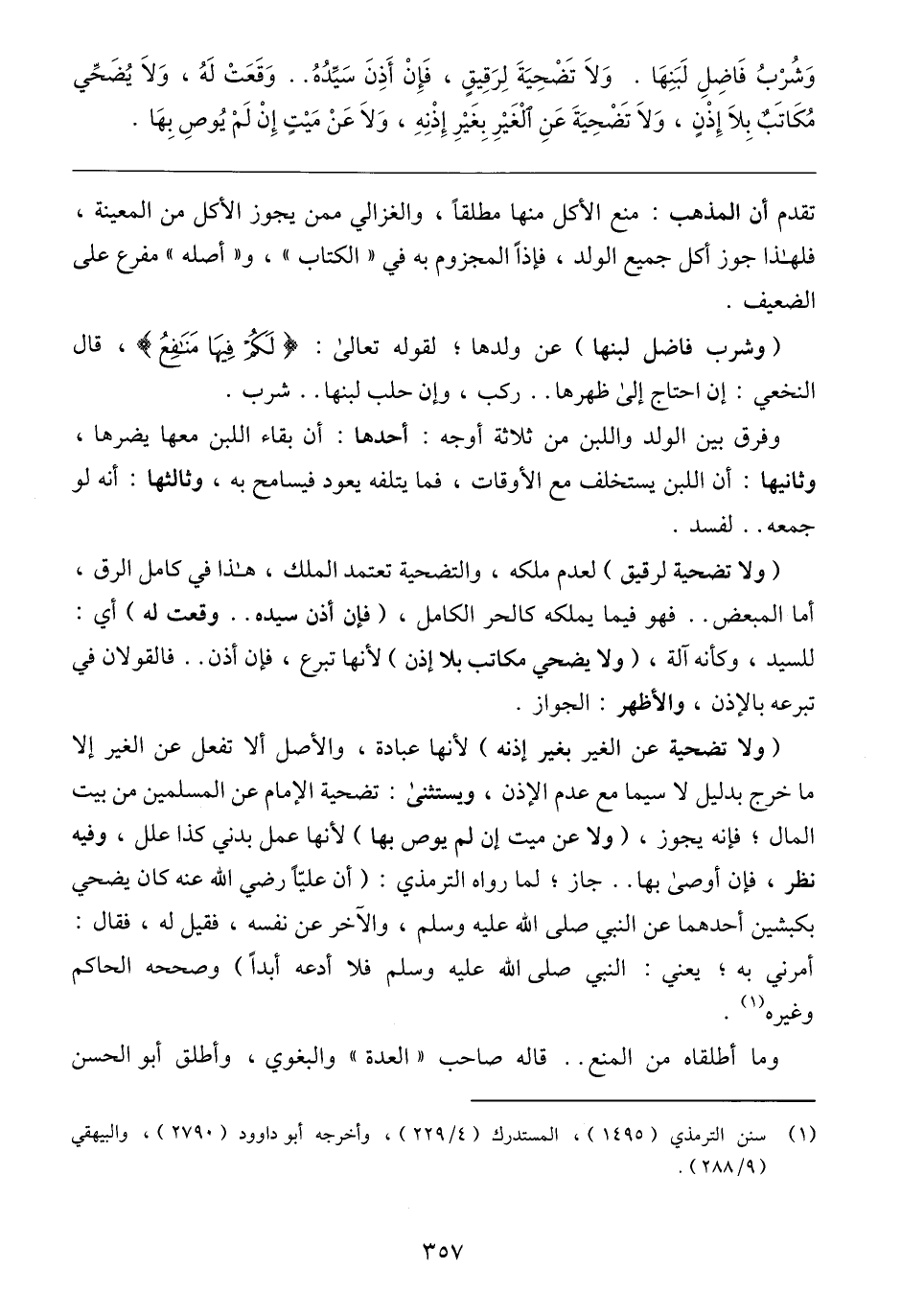 (ولا تضحية عن الغير بغير إذنه) لأنها عبادة، والأصل ألا تفعل عن الغير إلا ما خرج بدليل لا سيما مع عدم الإذن، ويستثنى: تضحية الإمام عن المسلمين من بيت المال؛ فإنه يجوز، (ولا عن ميت إن لم يوص بها) لأنها عمل بدني كذا علل، وفيه نظر، فإن أوصى بها .. جاز، لما رواه الترمذي: (أن عليًّا رضي الله عنه كان يضحي بكبشين أحدهما عن النبي صلى الله عليه وسلم، والآخر عن نفسه، فقيل له، فقال: أمرني به؛ يعني: النبي صلى الله عليه وسلم فلا أدعه أبدًا) وصححه الحاكم وغيره (١).