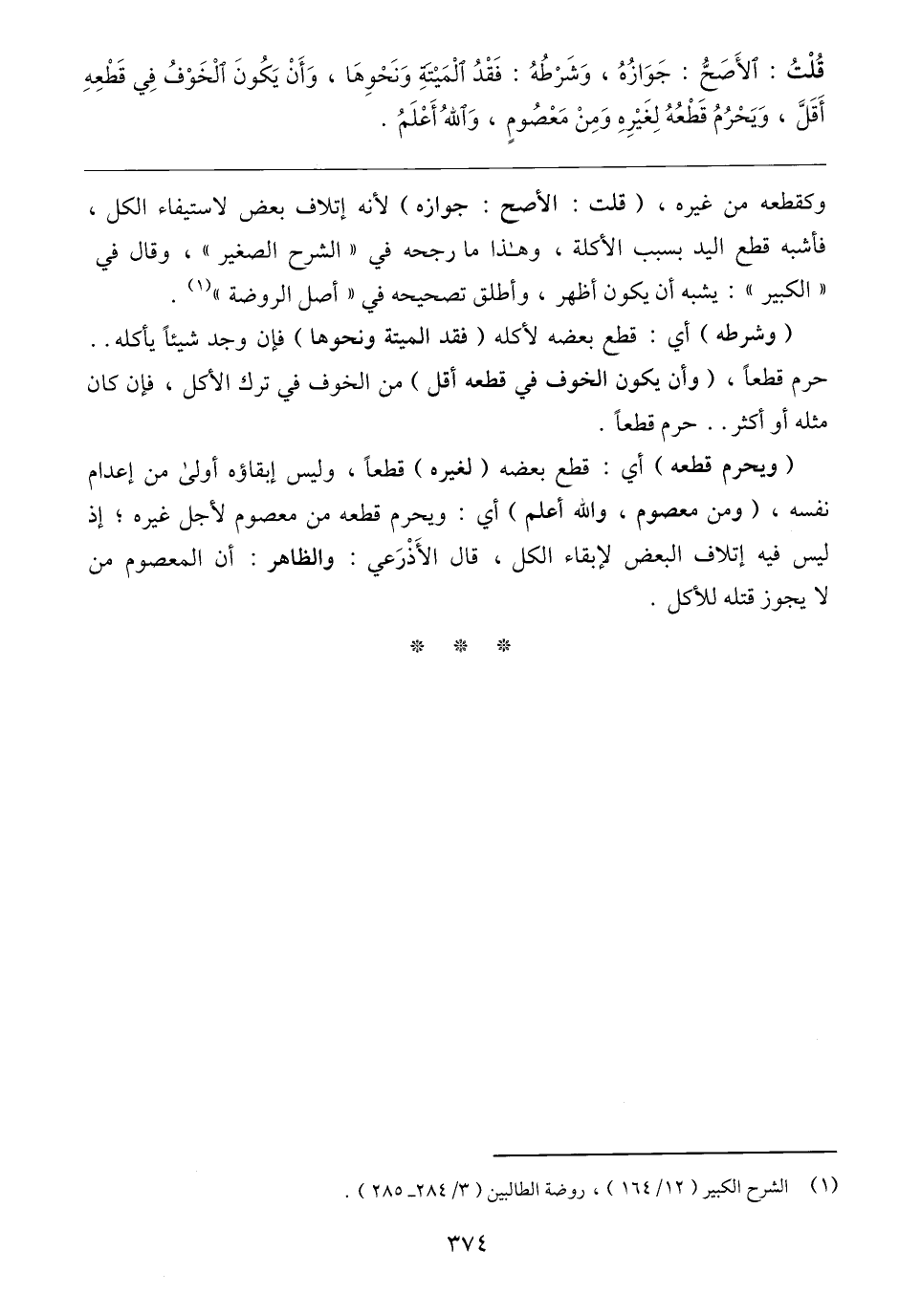 (وشرطه) أي: قطع بعضه لأكله (فقد الميتة ونحوها) فإن وجد شيئًا يأكله .. حرم قطعًا، (وأن يكون الخوف في قطعه أقل) من الخوف في ترك الأكل، فإن كان مثله أو أكثر .. حرم قطعًا.