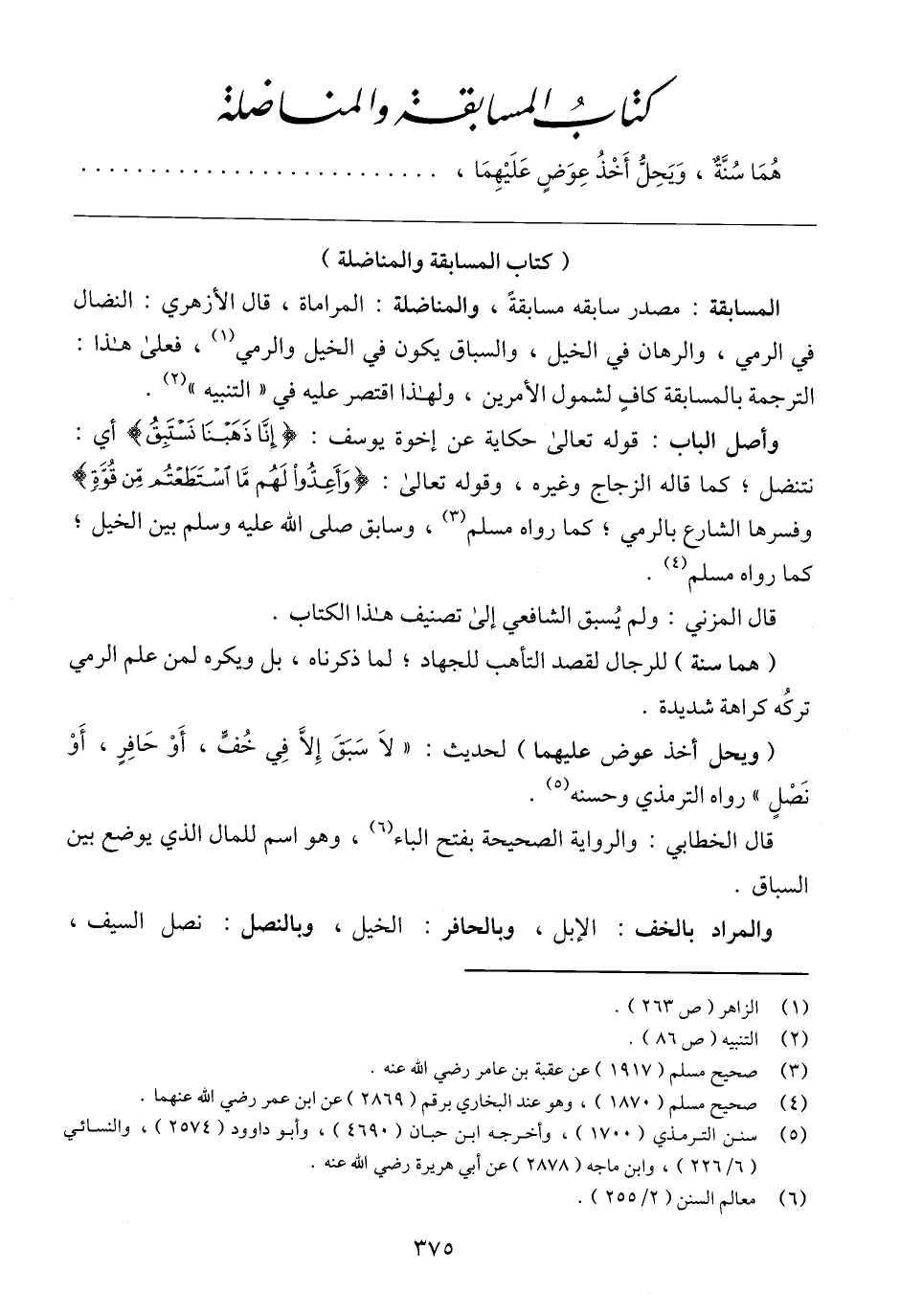 وأصل الباب: قوله تعالى حكاية عن إخوة يوسف: {إِنَّا ذَهَبْنَا نَسْتَبِقُ} أي: نتنضل؛ كما قاله الزجاج وغيره، وقوله تعالى: {وَأَعِدُّوا لَهُمْ مَا اسْتَطَعْتُمْ مِنْ قُوَّةٍ} وفسرها الشارع بالرمي؛ كما رواه مسلم (٣)، وسابق صلى الله عليه وسلم بين الخيل؛ كما رواه مسلم (٤).
