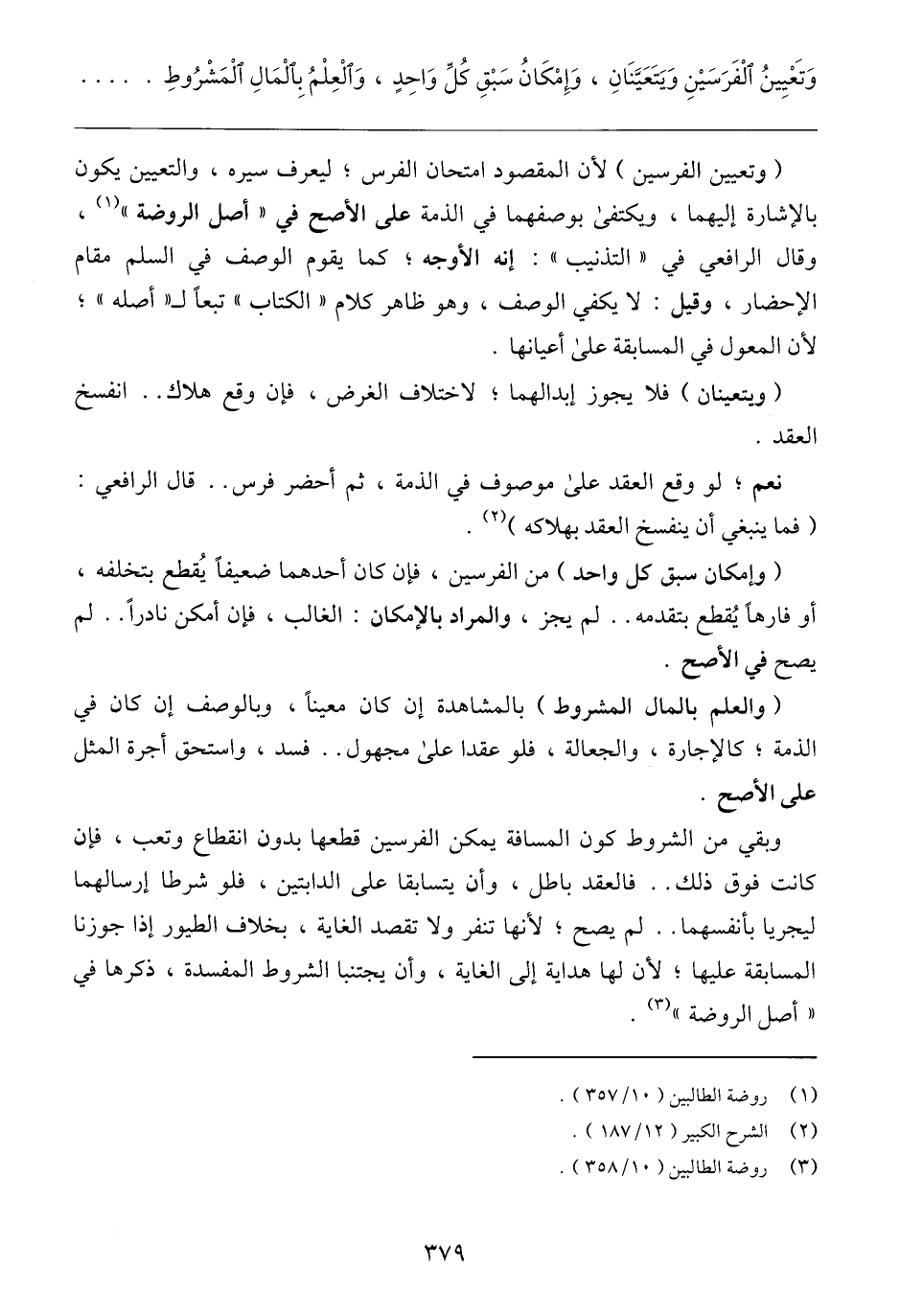 (وإمكان سبق كل واحد) من الفرسين، فإن كان أحدهما ضعيفًا يُقطع بتخلفه، أو فارهًا يُقطع بتقدمه .. لم يجز، والمراد بالإمكان: الغالب، فإن أمكن نادرًا .. لم يصح في الأصح.