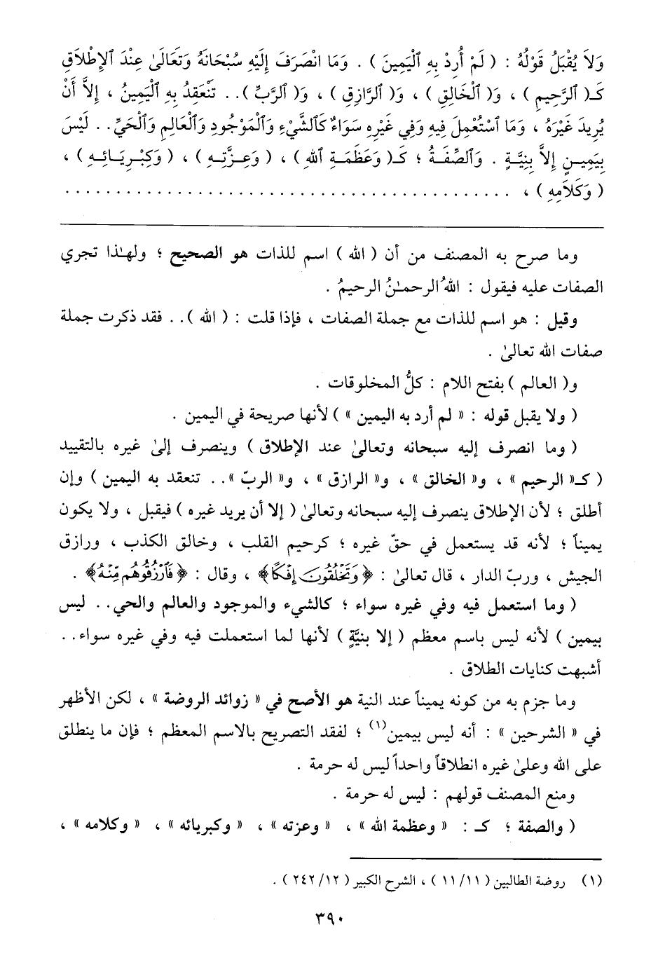 (وما انصرف إليه سبحانه وتعالى عند الإطلاق) وينصرف إلى غيره بالتقييد (كـ"الرحيم"، و"الخالق"، و"الرازق"، و"الربّ" .. تنعقد به اليمين) وإن أطلق؛ لأن الإطلاق ينصرف إليه سبحانه وتعالى (إلا أن يريد غيره) فيقبل، ولا يكون يمينًا؛ لأنه قد يستعمل في حقّ غيره؛ كرحيم القلب، وخالق الكذب، ورازق الجيش، وربّ الدار، قال تعالى: {وَتَخْلُقُونَ إِفْكًا}، وقال: {فَارْزُقُوهُمْ مِنْهُ}.