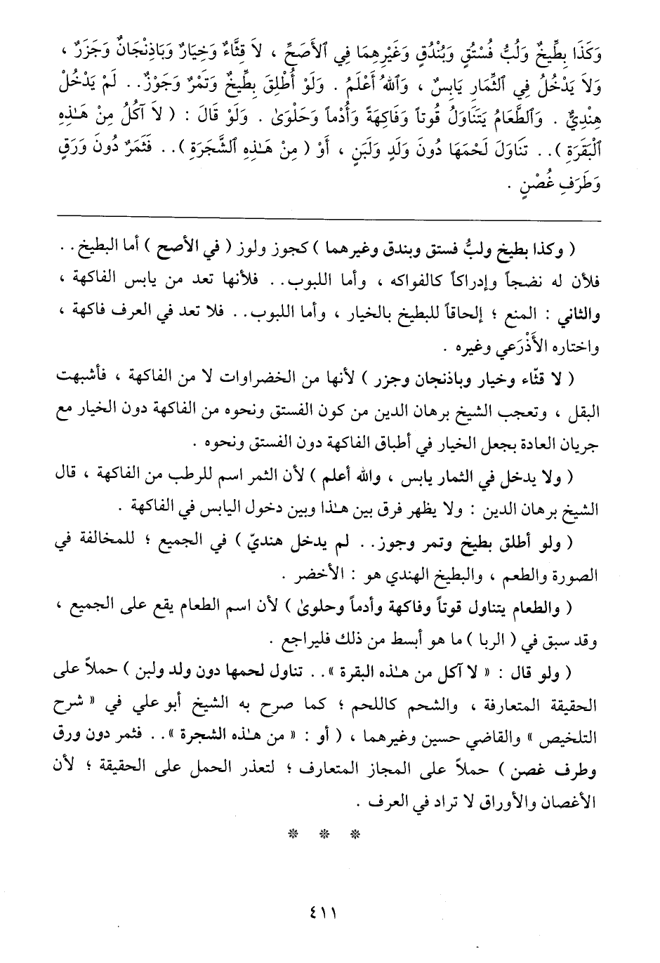 (ولو قال: "لا آكل من هذه البقرة" .. تناول لحمها دون ولد ولبن) حملًا على الحقيقة المتعارفة، والشحم كاللحم؛ كما صرح به الشيخ أبو علي في "شرح التلخيص" والقاضي حسين وغيرهما، (أو: "من هذه الشجرة" .. فثمر دون ورق وطرف غصن) حملًا على المجاز المتعارف؛ لتعذر الحمل على الحقيقة؛ لأن الأغصان والأوراق لا تراد في العرف.