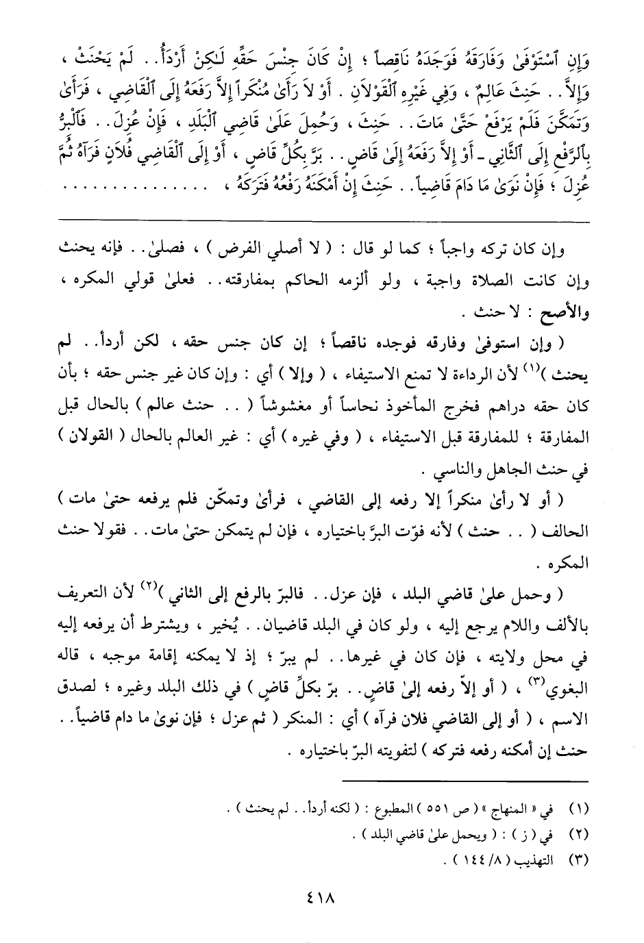 (وحمل على قاضي البلد، فإن عزل .. فالبرّ بالرفع إلى الثاني) (٢) لأن التعريف بالألف واللام يرجع إليه، ولو كان في البلد قاضيان .. يُخير، ويشترط أن يرفعه إليه في محل ولايته، فإن كان في غيرها .. لم يبرّ؛ إذ لا يمكنه إقامة موجبه، قاله البغوي (٣)، (أو إلّا رفعه إلى قاضٍ .. برّ بكلِّ قاضٍ) في ذلك البلد وغيره؛ لصدق الاسم، (أو إلى القاضي فلان فرآه) أي: المنكر (ثم عزل؛ فإن نوى ما دام قاضيًا .. حنث إن أمكنه رفعه فتركه) لتفويته البرّ باختياره.