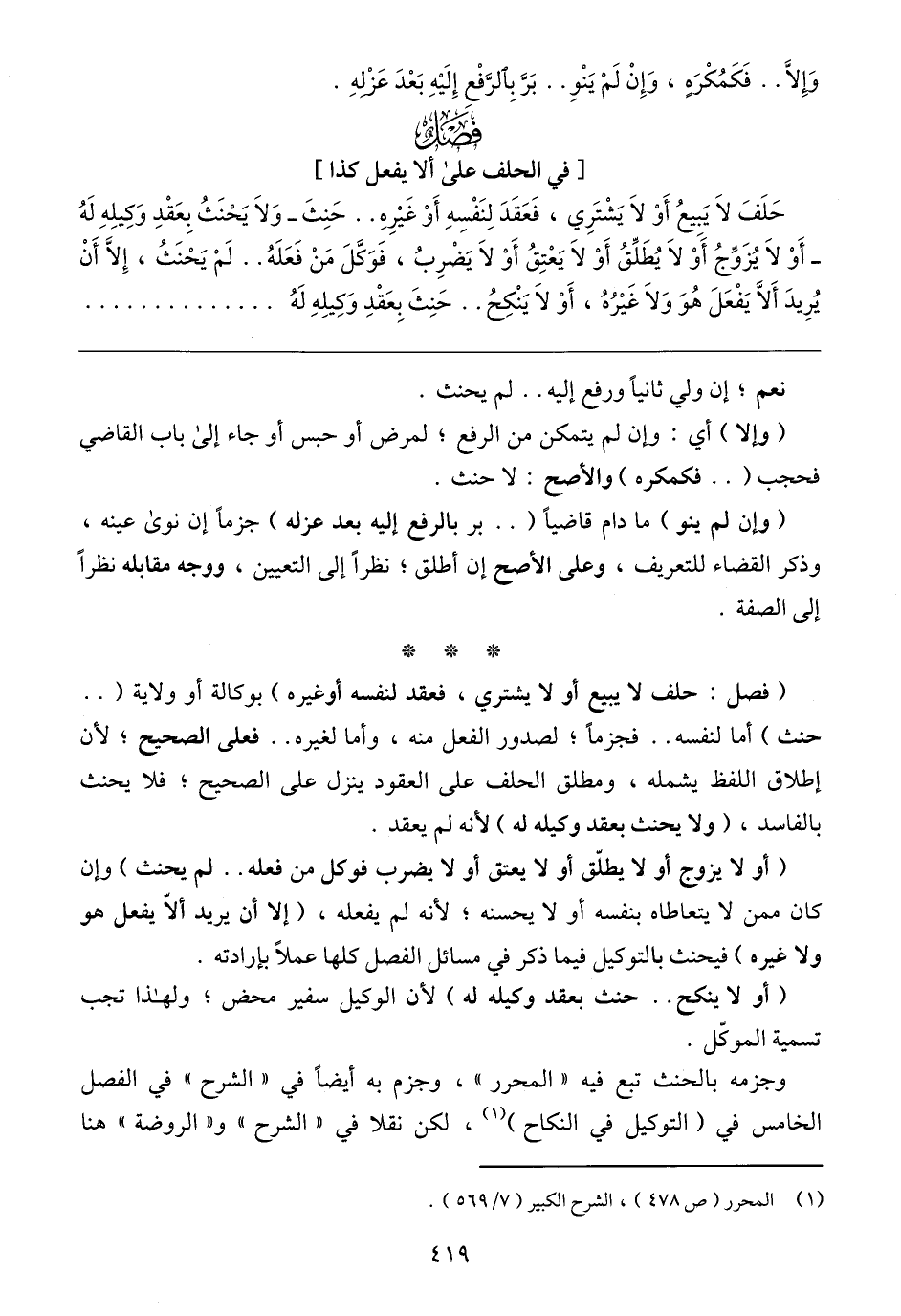 (فصل: حلف لا يبيع أو لا يشتري، فعقد لنفسه أوغيره) بوكالة أو ولاية ( .. حنث) أما لنفسه .. فجزمًا؛ لصدور الفعل منه، وأما لغيره .. فعلى الصحيح؛ لأن إطلاق اللفظ يشمله، ومطلق الحلف على العقود ينزل على الصحيح؛ فلا يحنث بالفاسد، (ولا يحنث بعقد وكيله له) لأنه لم يعقد.