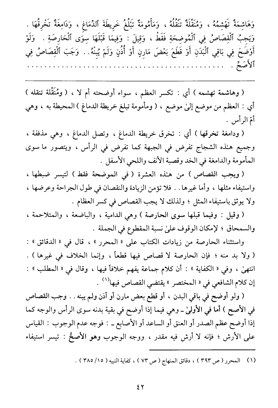 (ويجب القصاص) من هذه العشرة (في الموضحة فقط) لتيسر ضبطها، واستيفاء مثلها، وأما غيرها .. فلا تؤمن الزيادة والنقصان في طول الجراحة وعرضها، ولا يوثق باستيفاء المثل؛ ولذلك لا يجب القصاص في كسر العظام.