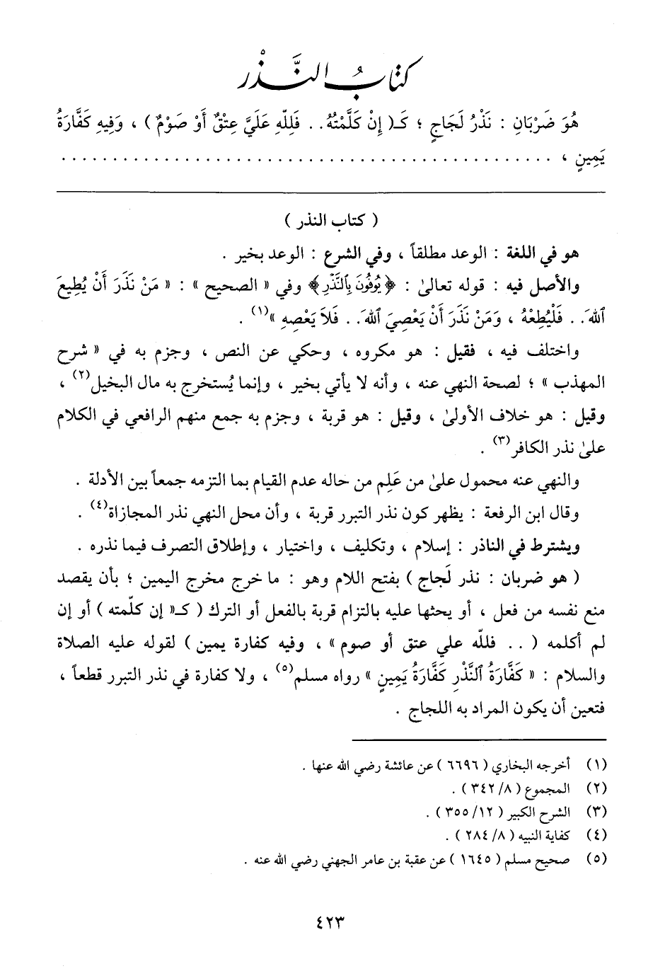 (هو ضربان: نذر لَجاج) بفتح اللام وهو: ما خرج مخرج اليمين؛ بأن يقصد منع نفسه من فعل، أو يحثها عليه بالتزام قربة بالفعل أو الترك (كـ "إن كلّمته) أو إن لم أكلمه ( .. فلله علي عتق أو صوم"، وفيه كفارة يمين) لقوله عليه الصلاة والسلام: "كَفَّارَةُ النَّذْرِ كَفَّارَةُ يَمِينٍ" رواه مسلم (٥)، ولا كفارة في نذر التبرر قطعًا، فتعين أن يكون المراد به اللجاج.