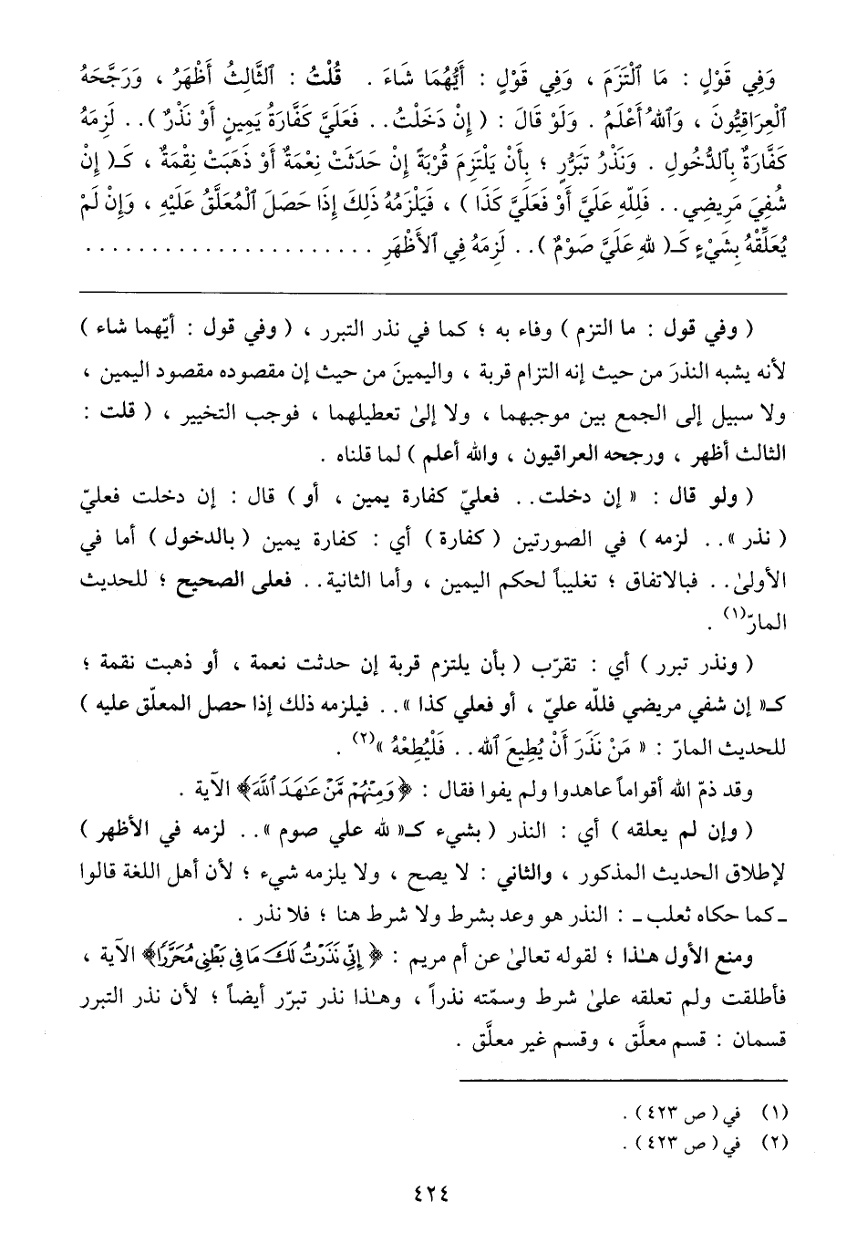 ومنع الأول هذا؛ لقوله تعالى عن أم مريم: {إِنِّي نَذَرْتُ لَكَ مَا فِي بَطْنِي مُحَرَّرًا} الآية، فأطلقت ولم تعلقه على شرط وسمّته نذرًا، وهذا نذر تبرّر أيضًا؛ لأن نذر التبرر قسمان: قسم معلَّق، وقسم غير معلَّق.