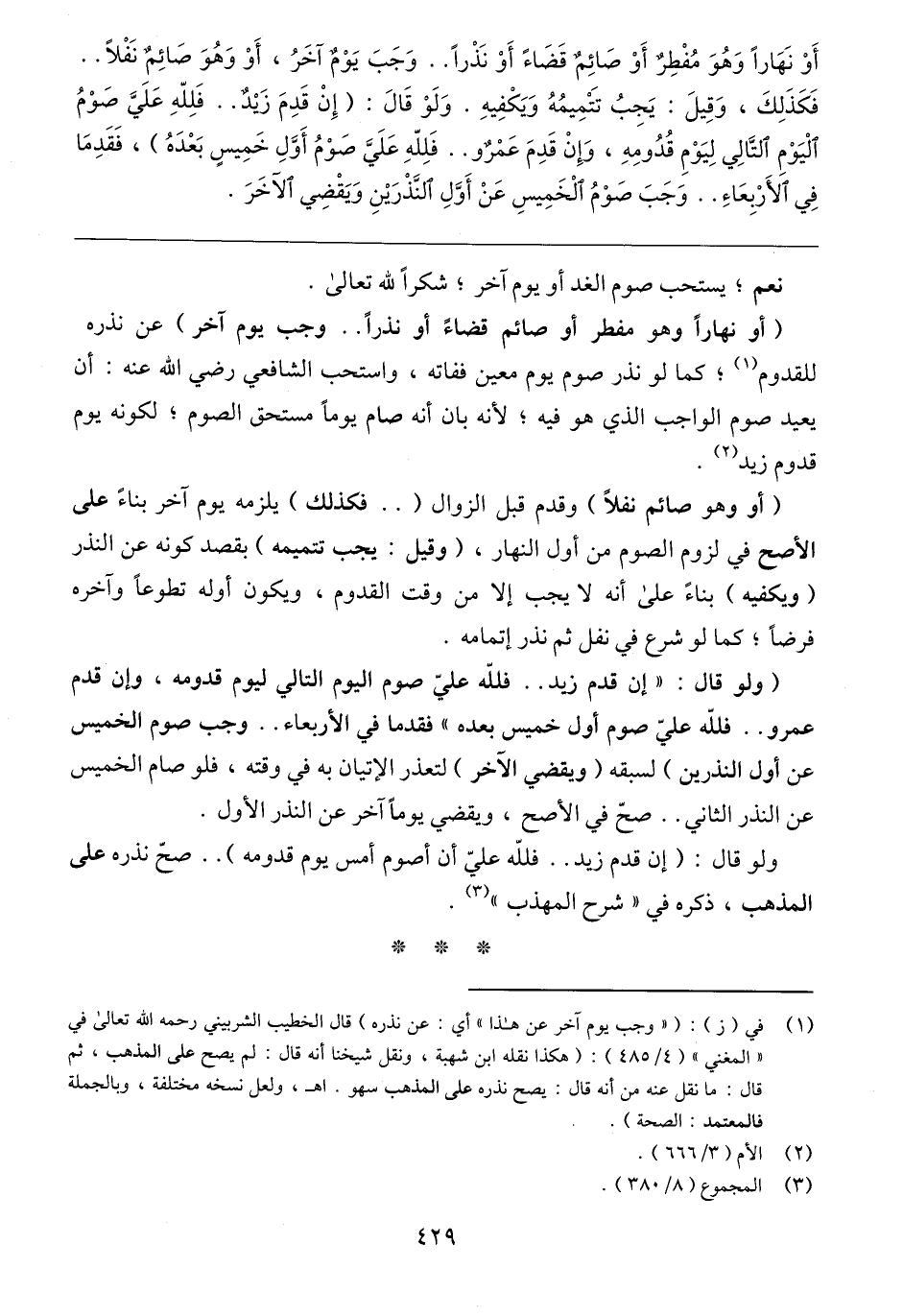 (١) في (ز): ("وجب يوم آخر عن هذا" أي: عن نذره) قال الخطيب الشربيني رحمه الله تعالى في "المغني" (٤/ ٤٨٥): (هكذا نقله ابن شهبة، ونقل شيخنا أنه قال: لم يصح على المذهب، ثم قال: ما نقل عنه من أنه قال: يصح نذره على المذهب سهو. اهـ، ولعل نسخه مختلفة، وبالجملة فالمعتمد: الصحة).