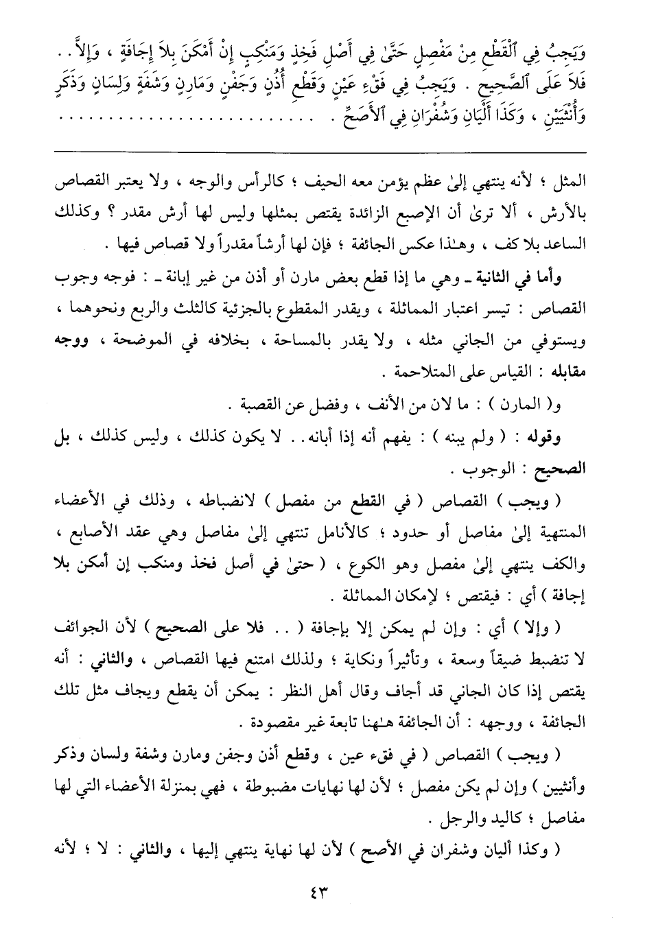 (ويجب) القصاص (في فقء عين، وقطع أذن وجفن ومارن وشفة ولسان وذكر وأنثيين) وإن لم يكن مفصل؛ لأن لها نهايات مضبوطة، فهي بمنزلة الأعضاء التي لها مفاصل؛ كاليد والرجل.