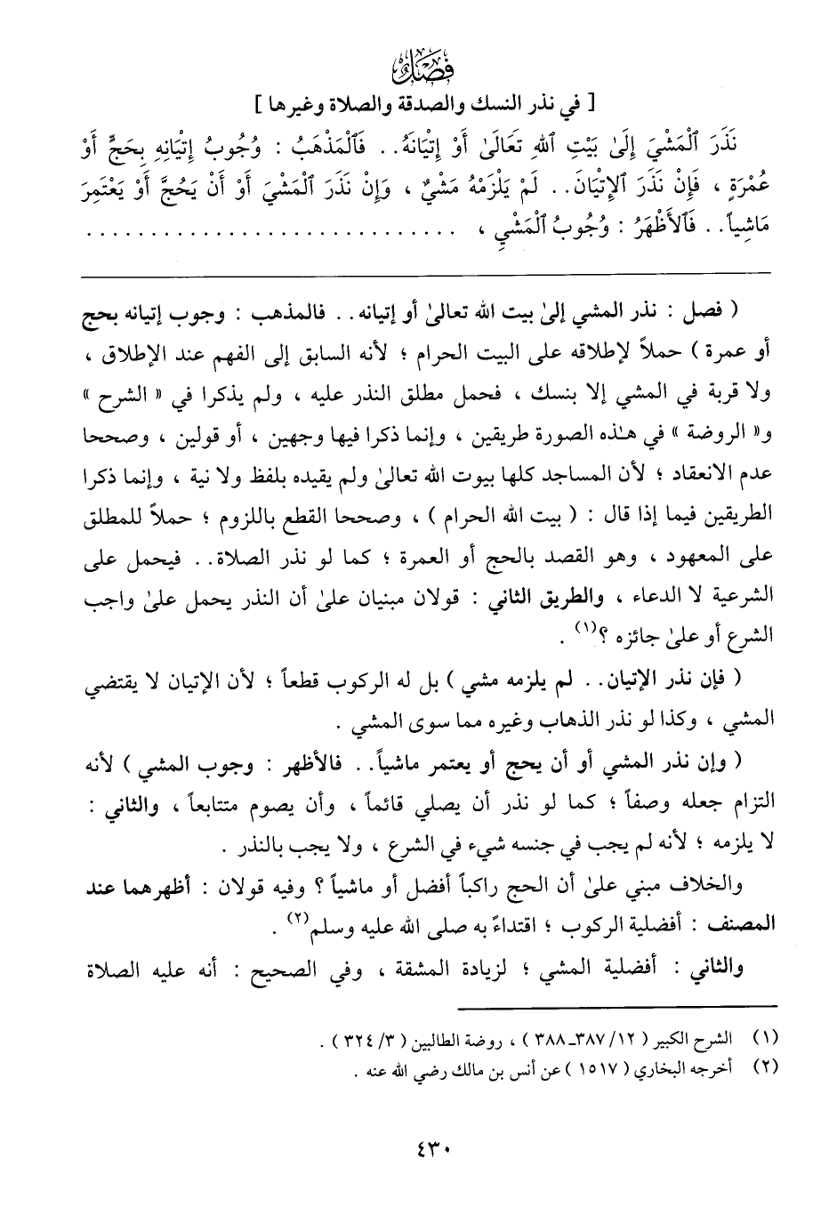 (فصل: نذر المشي إلى بيت الله تعالى أو إتيانه .. فالمذهب: وجوب إتيانه بحج أو عمرة) حملًا لإطلاقه على البيت الحرام؛ لأنه السابق إلى الفهم عند الإطلاق، ولا قربة في المشي إلا بنسك، فحمل مطلق النذر عليه، ولم يذكرا في "الشرح" و"الروضة" في هذه الصورة طريقين، وإنما ذكرا فيها وجهين، أو قولين، وصححا عدم الانعقاد؛ لأن المساجد كلها بيوت الله تعالى ولم يقيده بلفظ ولا نية، وإنما ذكرا الطريقين فيما إذا قال: (بيت الله الحرام)، وصححا القطع باللزوم؛ حملًا للمطلق على المعهود، وهو القصد بالحج أو العمرة؛ كما لو نذر الصلاة .. فيحمل على الشرعية لا الدعاء، والطريق الثاني: قولان مبنيان على أن النذر يحمل على واجب الشرع أو على جائزه؟ (١).