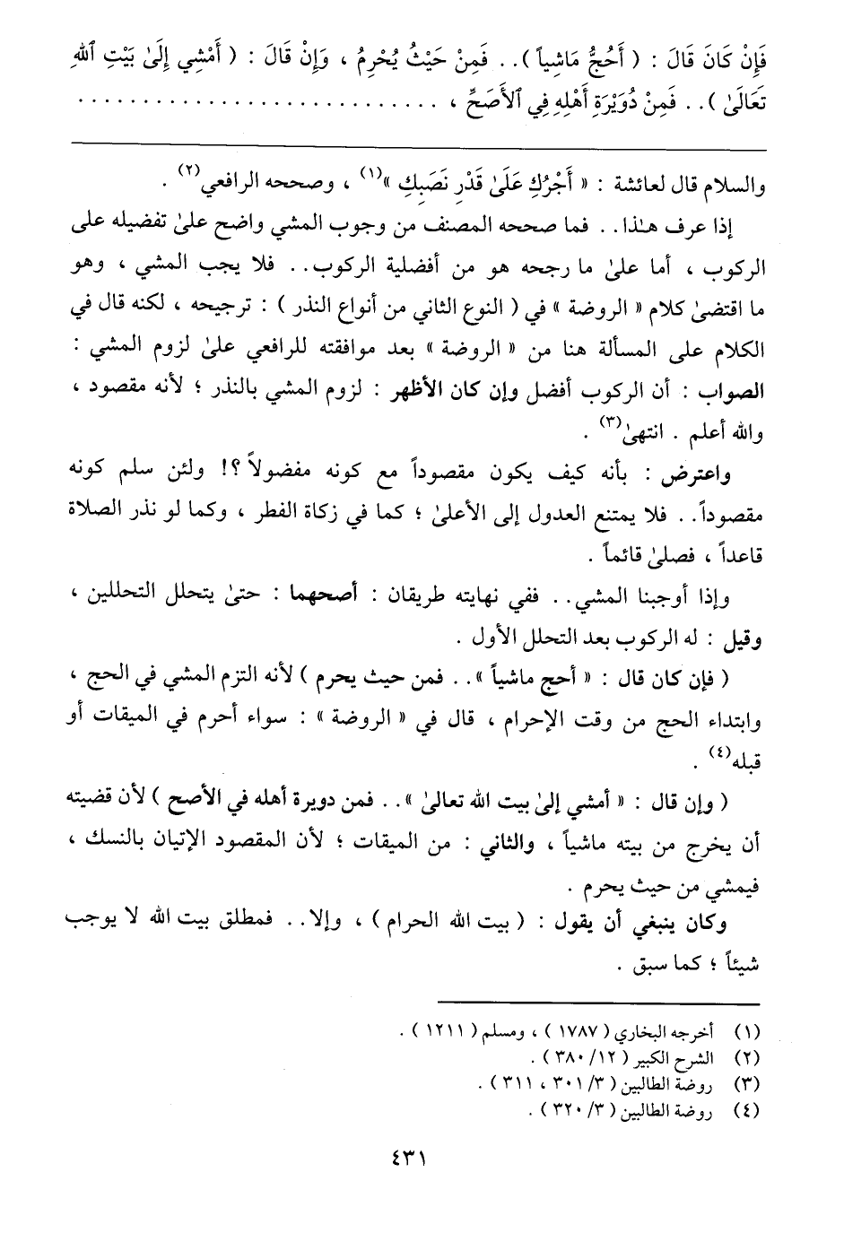 إذا عرف هذا .. فما صححه المصنف من وجوب المشي واضح على تفضيله على الركوب، أما على ما رجحه هو من أفضلية الركوب .. فلا يجب المشي، وهو ما اقتضى كلام "الروضة" في (النوع الثاني من أنواع النذر): ترجيحه، لكنه قال في الكلام على المسألة هنا من "الروضة" بعد موافقته للرافعي على لزوم المشي: الصواب: أن الركوب أفضل وإن كان الأظهر: لزوم المشي بالنذر؛ لأنه مقصود، والله أعلم. انتهى (٣).