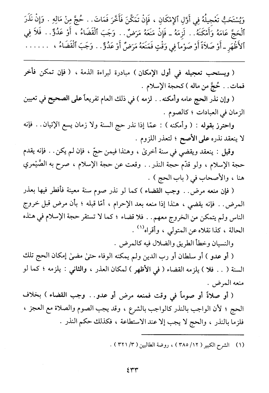 واحترز بقوله: (وأمكنه): عمّا إذا نذر حج السنة ولا زمان يسع الإتيان .. فإنه لا ينعقد نذره على الأصح؛ لتعذر اللزوم.
