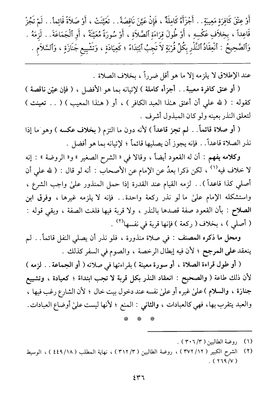 ومحل ما ذكره المصنف: في صلاة منذورة، فلو نذر أن يصلي النفل قائمًا .. لم ينعقد على المرجح، لأن فيه إبطال الرخصة، والصوم في السفر كذلك.