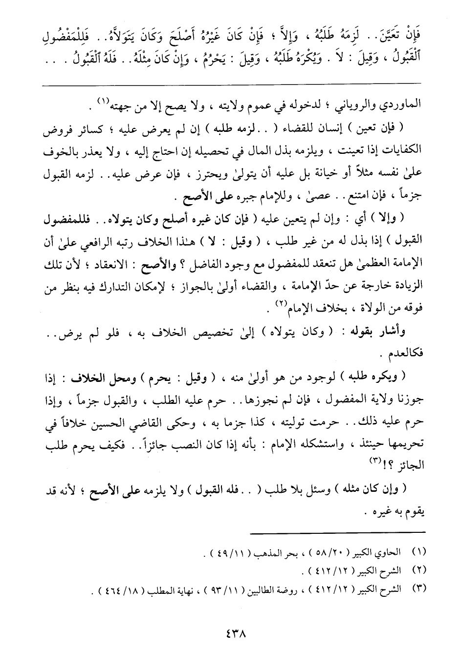 (ويكره طلبه) لوجود من هو أولى منه، (وقيل: يحرم) ومحل الخلاف: إذا جوزنا ولاية المفضول، فإن لم نجوزها .. حرم عليه الطلب، والقبول جزمًا، وإذا حرم عليه ذلك .. حرمت توليته، كذا جزما به، وحكى القاضي الحسين خلافًا في تحريمها حينئذ، واستشكله الإمام: بأنه إذا كان النصب جائزًا .. فكيف يحرم طلب الجائز؟ ! (٣)