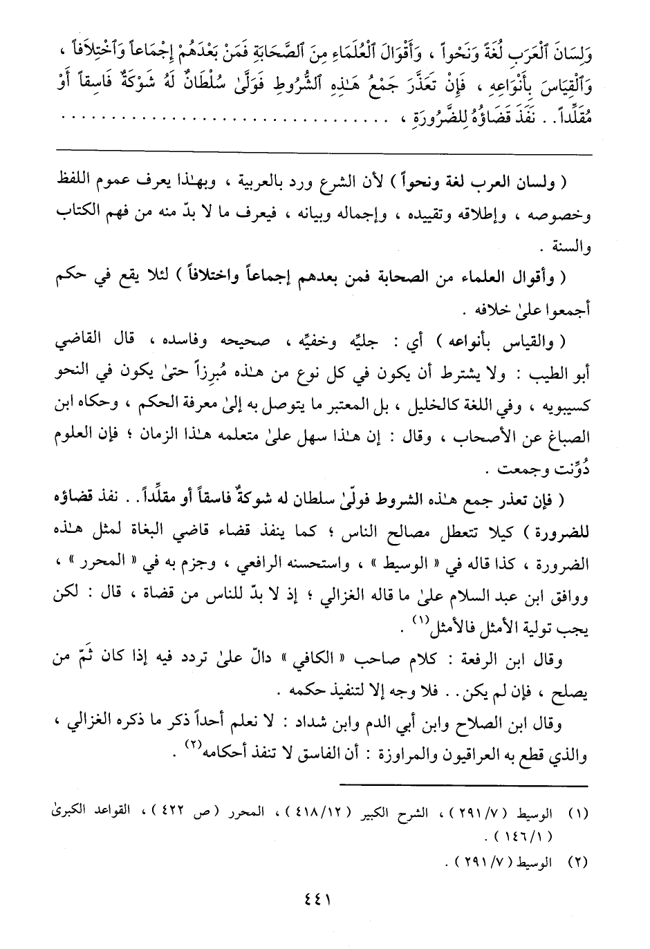 وقال ابن الصلاح وابن أبي الدم وابن شداد: لا نعلم أحدًا ذكر ما ذكره الغزالي، والذي قطع به العراقيون والمراوزة: أن الفاسق لا تنفذ أحكامه (٢).