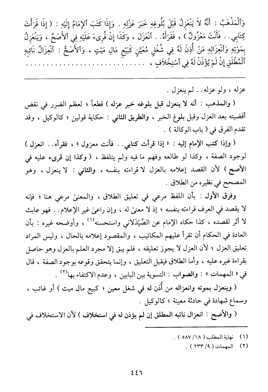 (والمذهب: أنه لا ينعزل قبل بلوغه خبر عزله) قطعًا؛ لعظم الضرر في نقض أقضيته بعد العزل وقبل بلوغ الخبر، والطريق الثاني: حكاية قولين؛ كالوكيل، وقد تقدم الفرق في (باب الوكالة).
