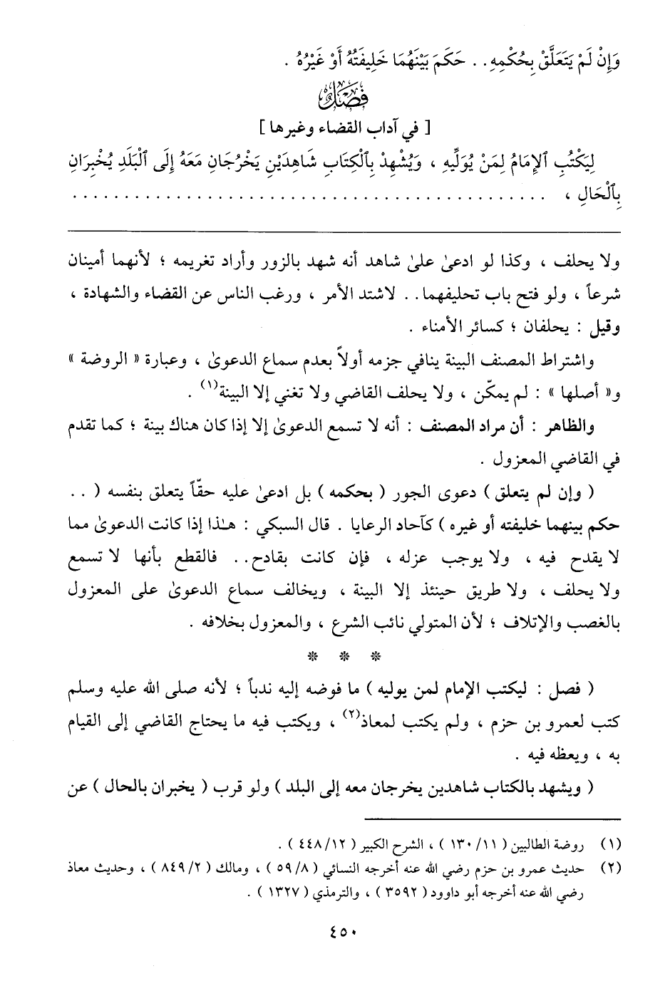 (فصل: ليكتب الإمام لمن يوليه) ما فوضه إليه ندبًا؛ لأنه صلى الله عليه وسلم كتب لعمرو بن حزم، ولم يكتب لمعاذ (٢)، ويكتب فيه ما يحتاج القاضي إلى القيام به، ويعظه فيه.