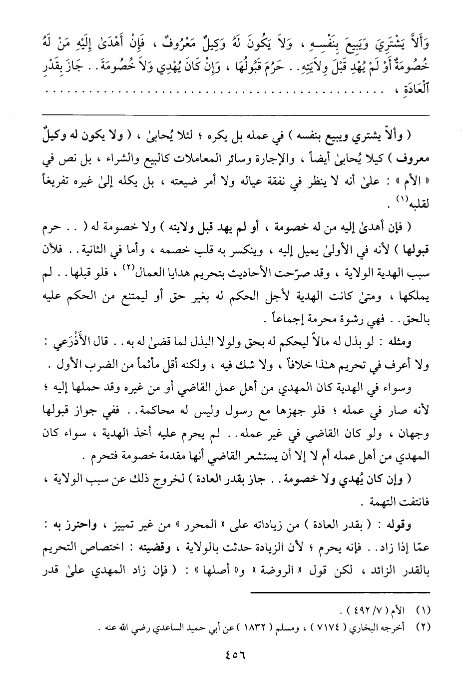 (فإن أهدى إليه من له خصومة، أو لم يهد قبل ولايته) ولا خصومة له ( .. حرم قبولها) لأنه في الأولى يميل إليه، وينكسر به قلب خصمه، وأما في الثانية .. فلأن سبب الهدية الولاية، وقد صرّحت الأحاديث بتحريم هدايا العمال (٢)، فلو قبلها .. لم يملكها، ومتى كانت الهدية لأجل الحكم له بغير حق أو ليمتنع من الحكم عليه بالحق .. فهي رشوة محرمة إجماعًا.