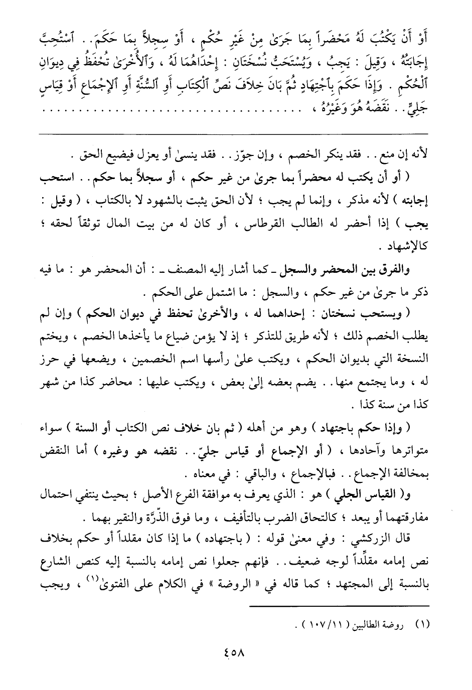 (وإذا حكم باجتهاد) وهو من أهله (ثم بان خلاف نص الكتاب أو السنة) سواء متواترها وآحادها، (أو الإجماع أو قياس جليّ .. نقضه هو وغيره) أما النقض بمخالفة الإجماع .. فبالإجماع، والباقي: في معناه.