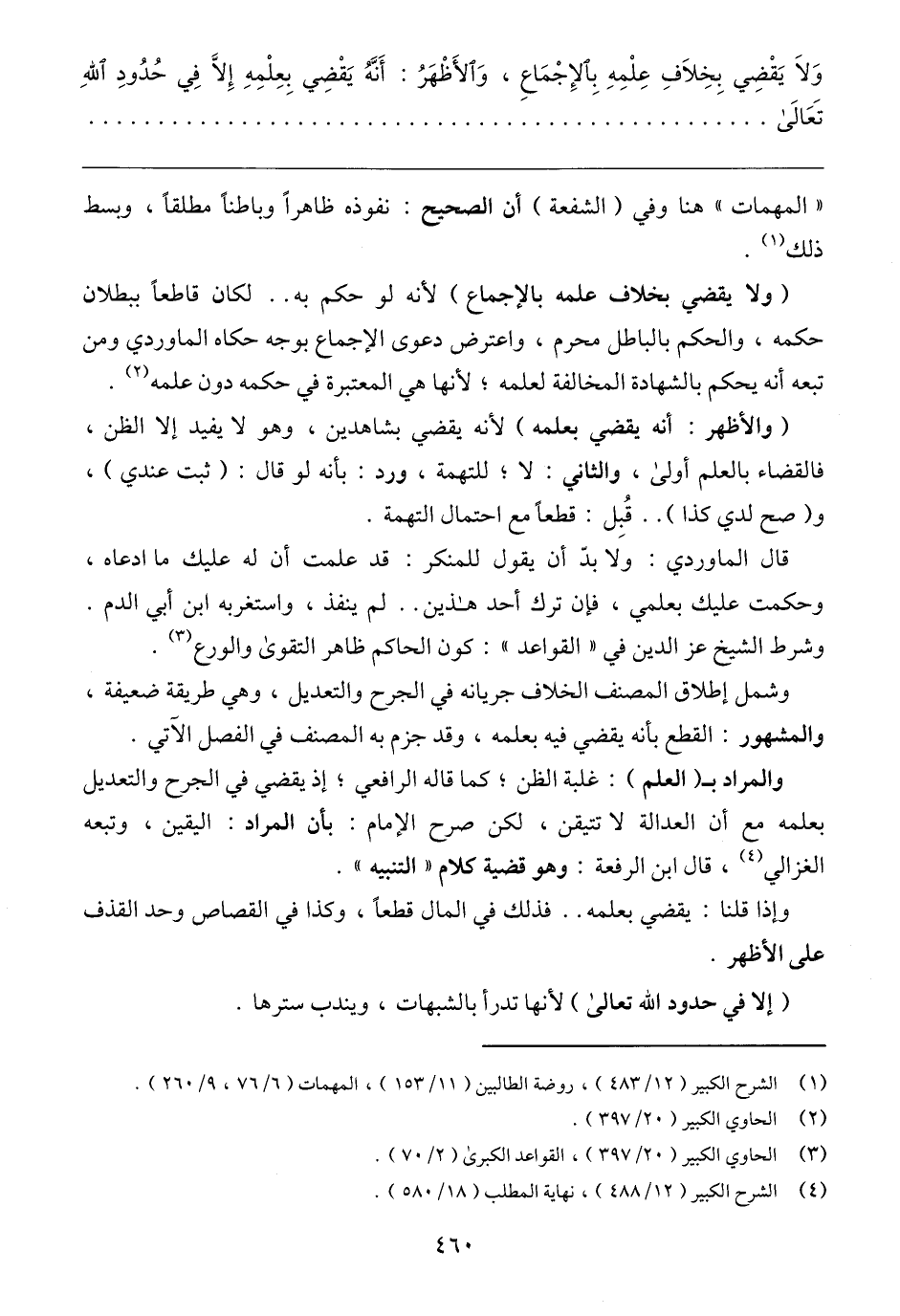 والمراد بـ (العلم): غلبة الظن؛ كما قاله الرافعي؛ إذ يقضي في الجرح والتعديل بعلمه مع أن العدالة لا تتيقن، لكن صرح الإمام: بأن المراد: اليقين، وتبعه الغزالي (٤)، قال ابن الرفعة: وهو قضية كلام "التنبيه".