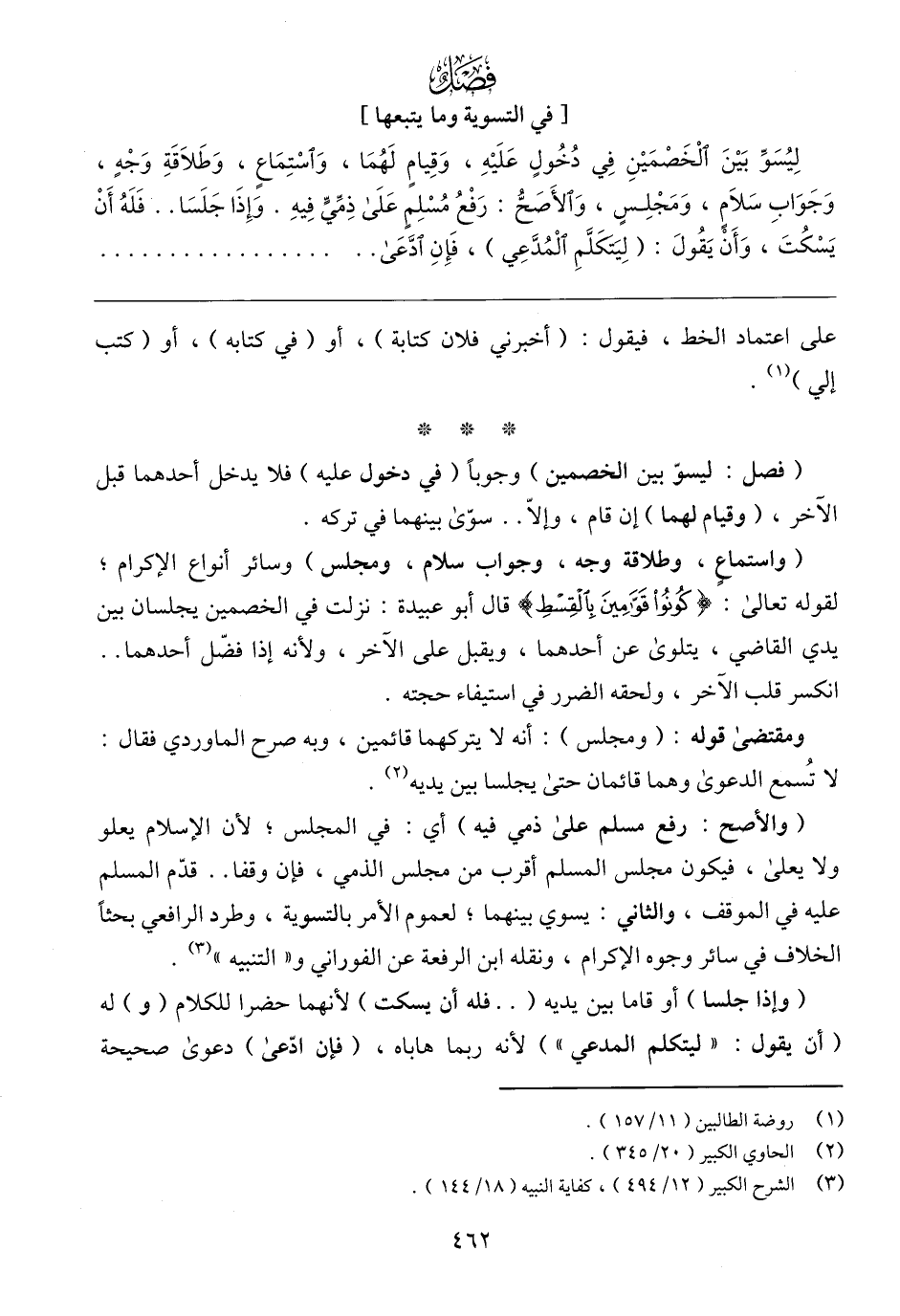 (فصل: ليسوّ بين الخصمين) وجوبًا (في دخول عليه) فلا يدخل أحدهما قبل الآخر، (وقيام لهما) إن قام، وإلّا .. سوّى بينهما في تركه.