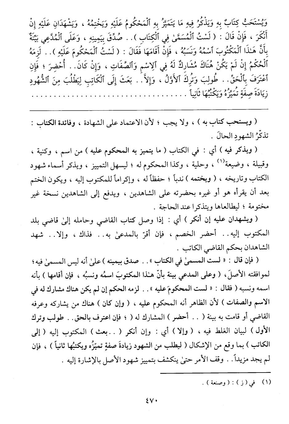(ويذكر فيه) أي: في الكتاب (ما يتميز به المحكوم عليه) من اسم، وكنية، وقبيلة، وضيعة (١)، وحلية، وكذا المحكوم له؛ ليسهل التمييز، ويذكر أسماء شهود الكتاب وتاريخه، (ويختمه) ندبًا، حفظًا له، وإكرامًا للمكتوب إليه، ويكون الختم بعد أن يقرأه هو أو غيره بحضرته على الشاهدين، ويدفع إلى الشاهدين نسخة غير مختومة، ليطالعاها ويتذكرا عند الحاجة.