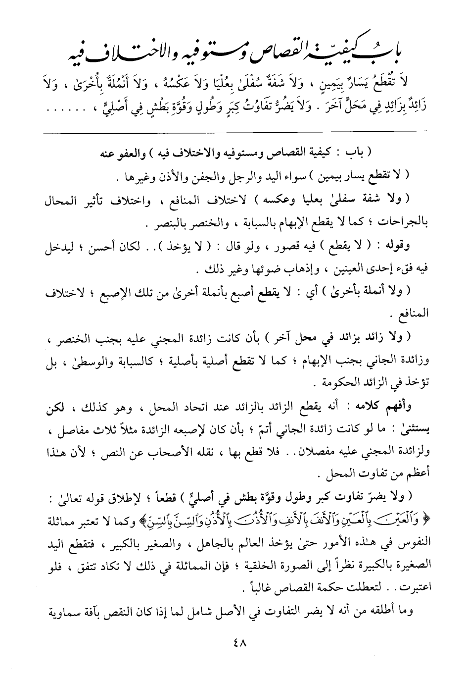 (ولا يضرّ تفاوت كبر وطول ودوَّة بطش في أصليٍّ) قطعًا؛ لإطلاق قوله تعالى: {وَالْعَيْنَ بِالْعَيْنِ وَالْأَنْفَ بِالْأَنْفِ وَالْأُذُنَ بِالْأُذُنِ وَالسِّنَّ بِالسِّنِّ} وكما لا تعتبر مماثلة النفوس في هذه الأمور حتى يؤخذ العالم بالجاهل، والصغير بالكبير، فتقطع اليد الصغيرة بالكبيرة نظرًا إلى الصورة الخلقية؛ فإن المماثلة في ذلك لا تكاد تتفق، فلو اعتبرت .. لتعطلت حكمة القصاص غالبًا.