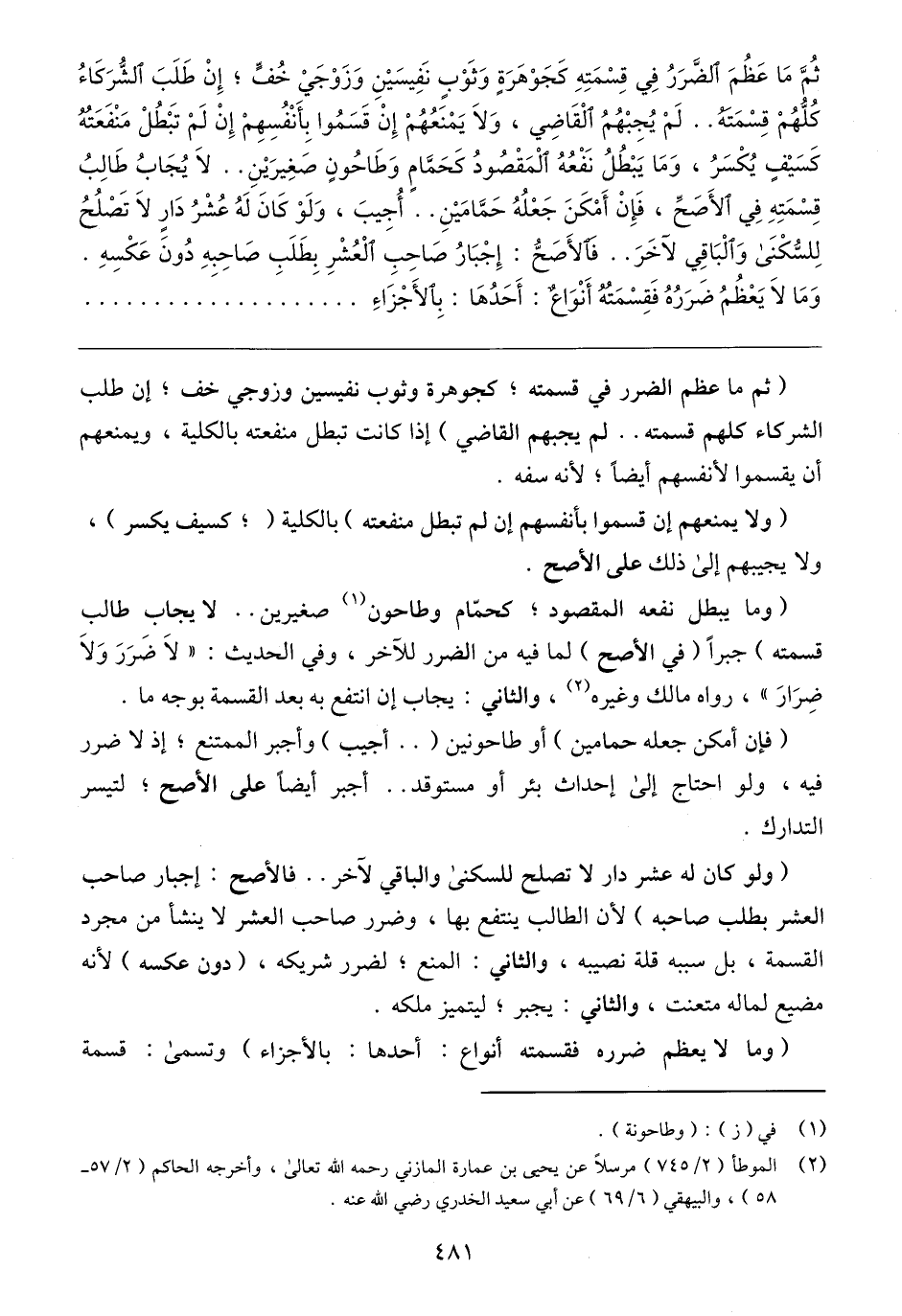 (وما يبطل نفعه المقصود؛ كحمّام وطاحون (١) صغيرين .. لا يجاب طالب قسمته) جبرأ (في الأصح) لما فيه من الضرر للآخر، وفي الحديث: "لَا ضَرَرَ وَلَا ضِرَارَ"، رواه مالك وغيره (٢)، والثاني: يجاب إن انتفع به بعد القسمة بوجه ما.