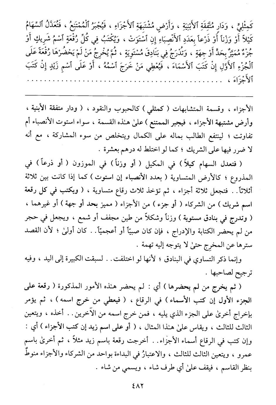 الأجزاء، وقسمة المتشابهات (كمثلي) كالحبوب والنقود، (ودار متفقة الأبنية، وأرض مشتبهة الأجزاء، فيجبر الممتنع) على هذه القسمة، سواء استوت الأنصباء أم تفاوتت؛ لينتفع الطالب بماله على الكمال ويتخلص من سوء المشاركة، مع أنه لا ضرر فيها على الشريك؛ كما لو اختلط له درهم بعشرة.