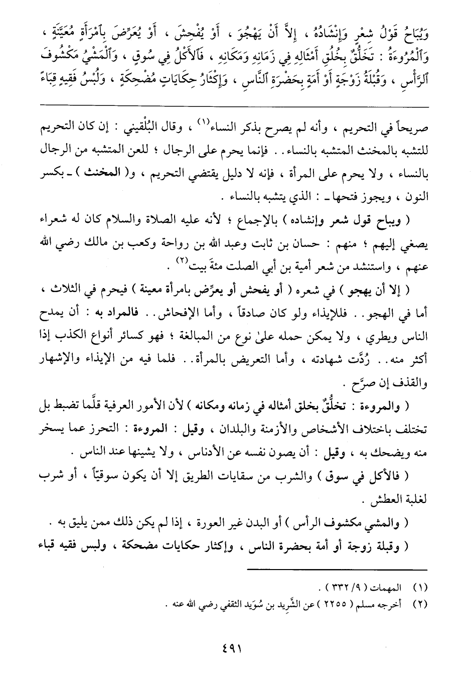 صريحًا في التحريم، وأنه لم يصرح بذكر النساء (١)، وقال البُلْقيني: إن كان التحريم للتشبه بالمخنث المتشبه بالنساء .. فإنما يحرم على الرجال؛ للعن المتشبه من الرجال بالنساء، ولا يحرم على المرأة، فإنه لا دليل يقتضي التحريم، و (المخنث) - بكسر النون، ويجوز فتحها -: الذي يتشبه بالنساء.