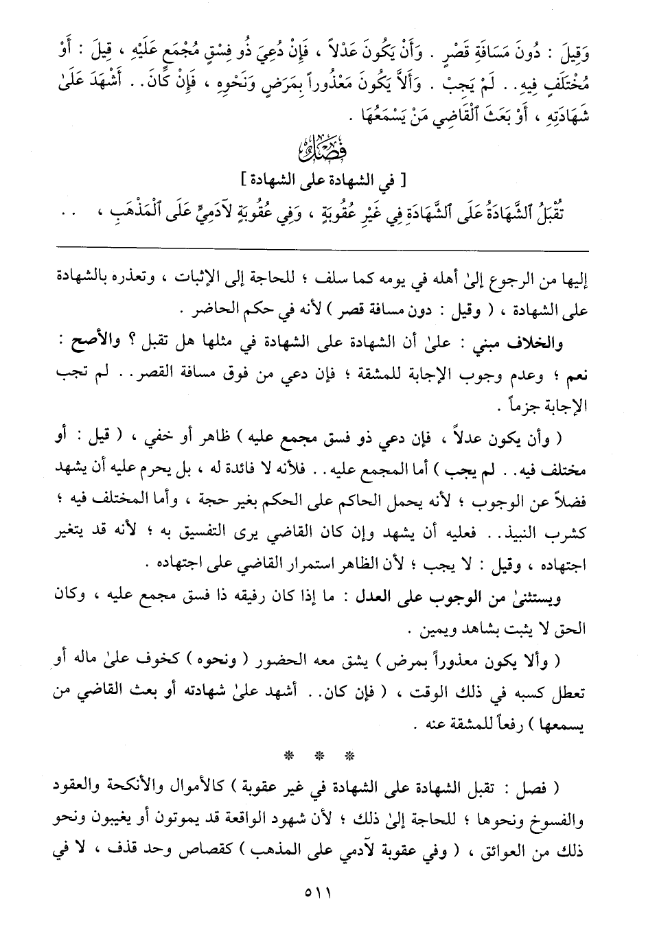 (فصل: تقبل الشهادة على الشهادة في غير عقوبة) كالأموال والأنكحة والعقود والفسوخ ونحوها؛ للحاجة إلى ذلك؛ لأن شهود الواقعة قد يموتون أو يغيبون ونحو ذلك من العوائق، (وفي عقوبة لآدمي على المذهب) كقصاص وحد قذف، لا في