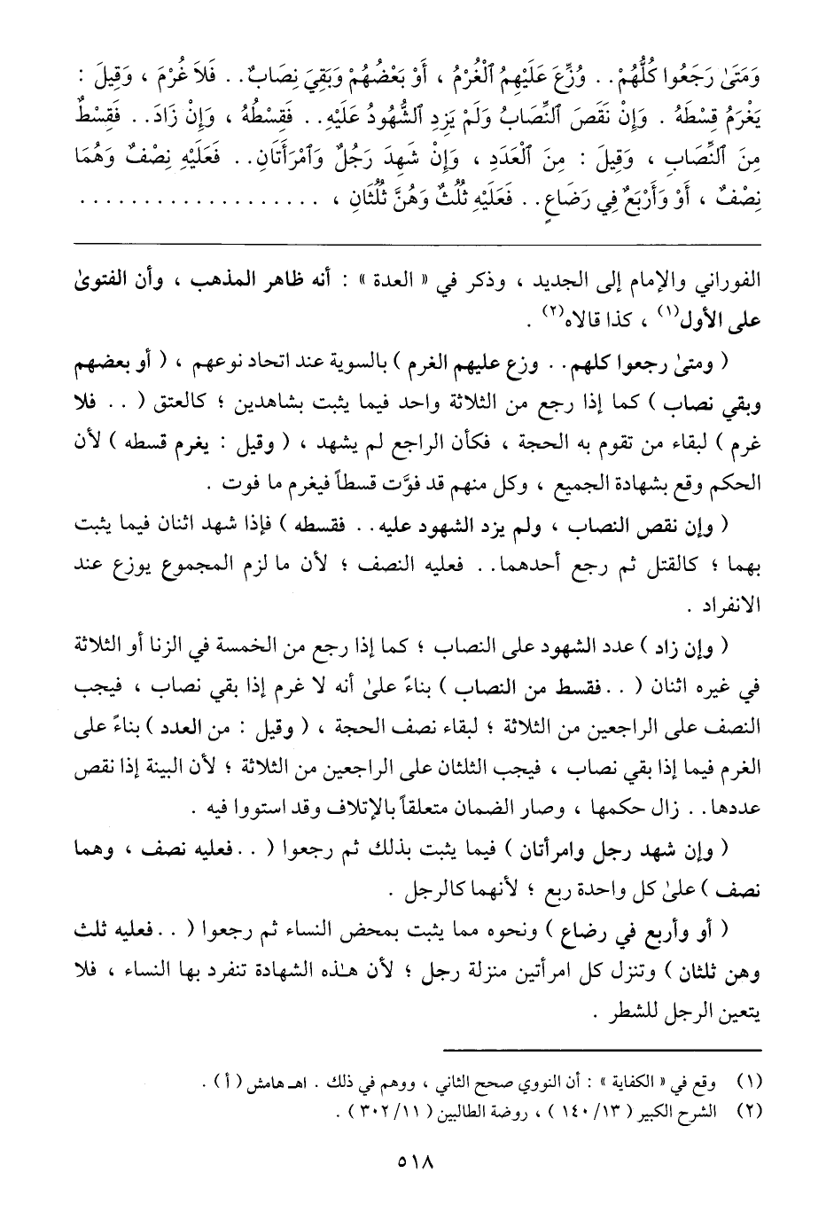 (ومتى رجعوا كلهم .. وزع عليهم الغرم) بالسوية عند اتحاد نوعهم، (أو بعضهم وبقي نصاب) كما إذا رجع من الثلاثة واحد فيما يثبت بشاهدين؛ كالعتق ( .. فلا غرم) لبقاء من تقوم به الحجة، فكأن الراجع لم يشهد، (وقيل: يغرم قسطه) لأن الحكم وقع بشهادة الجميع، وكل منهم قد فوَّت قسطًا فيغرم ما فوت.