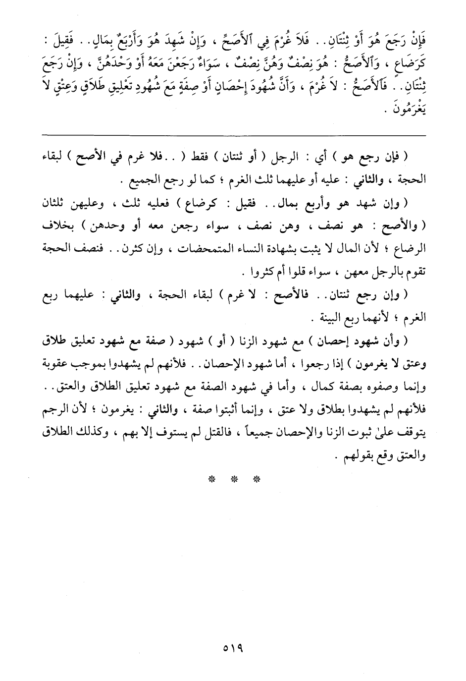 (وأن شهود إحصان) مع شهود الزنا (أو) شهود (صفة مع شهود تعليق طلاق وعتق لا يغرمون) إذا رجعوا، أما شهود الإحصان .. فلأنهم لم يشهدوا بموجب عقوبة وإنما وصفوه بصفة كمال، وأما في شهود الصفة مع شهود تعليق الطلاق والعتق .. فلأنهم لم يشهدوا بطلاق ولا عتق، وإنما أثبتوا صفة، والثاني: يغرمون؛ لأن الرجم يتوقف على ثبوت الزنا والإحصان جميعًا، فالقتل لم يستوف إلا بهم، وكذلك الطلاق والعتق وقع بقولهم.