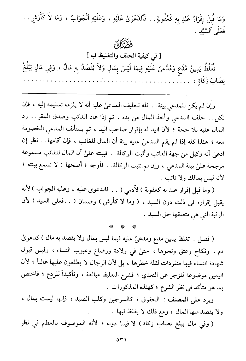(فصل: تغلظ يمين مدع ومدعىً عليه فيما ليس بمال ولا يقصد به مال) كدعوى دم، ونكاح وعتق ونحوها، حتى في ولادة ورضاع وعيوب النساء، وليس قبول شهادة النساء فيها منفردات لقلة خطرها، بل لأن الرجال لا يطلعون عليها غالبًا؛ لأن اليمين موضوعة للزجر عن التعدي؛ فشرع التغليظ مبالغة، وتأكيدًا للردع؛ فاختص بما هو متأكد في نظر الشرع؛ كهذه المذكورات.