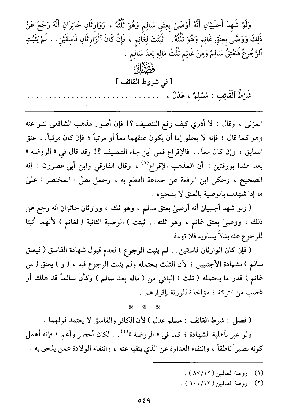 المزني، وقال: لا أدري كيف وقع التنصيف؟ ! فإن أصول مذهب الشافعي تنبو عنه وهو كما قال؛ فإنه لا يخلو إما أن يكون عتقهما معًا أو مرتبًا؛ فإن كان مرتبًا .. عتق السابق، وإن كان معًا .. فالإقراع فمن أين جاء التنصيف؟ ! وقد قال في "الروضة" بعد هذا بورقتين: أن المذهب الإقراع (١)، وقال الفارقي وابن أبي عصرون: إنه الصحيح، وحكى ابن الرفعة عن جماعة القطع به، وحمل نصَّ "المختصر" على ما إذا شهدت بالوصية بالعتق لا بتنجيزه.
